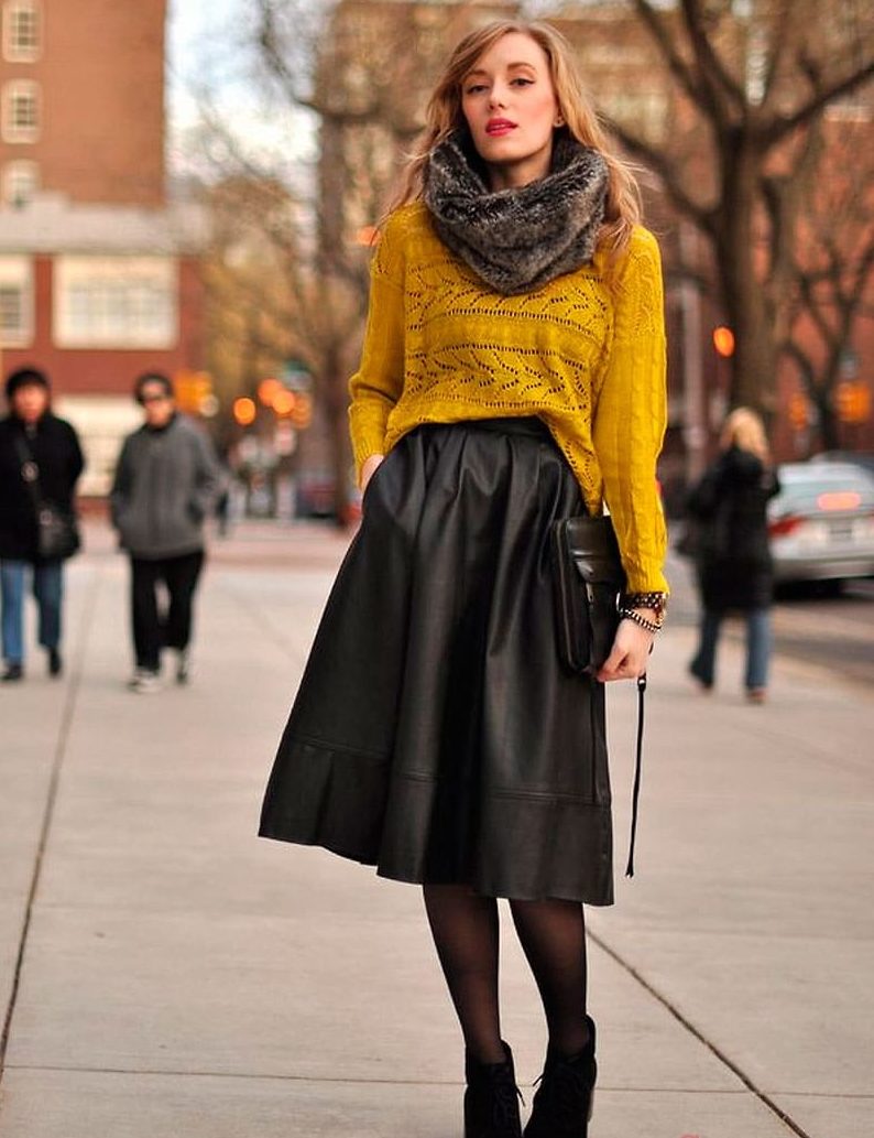 For owners of a full rectangle, it is better to choose a knee-length skirt-a-line. And in everyday style, you have no color restrictions on the choice of such a skirt. Wear a skirt, t-shirts, polo shirts, sweaters, turtlenecks, and warm or light sweaters without any problems. And most importantly, make it a rule that if you choose a baggy top, it will be better to wear it out of the box. If your top is fitted, it is better to fill it in a skirt or leave it as it is, if the item is of standard length.