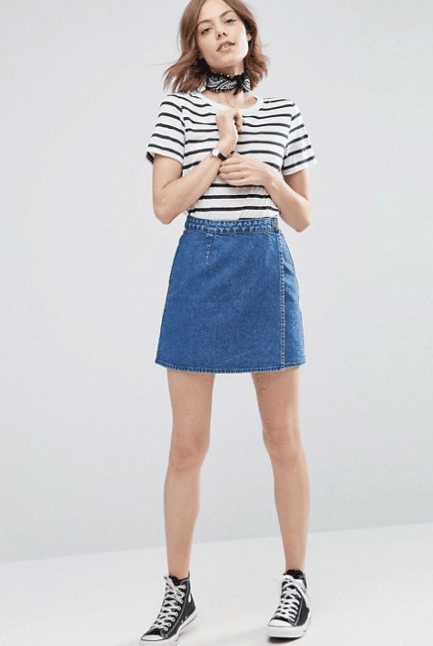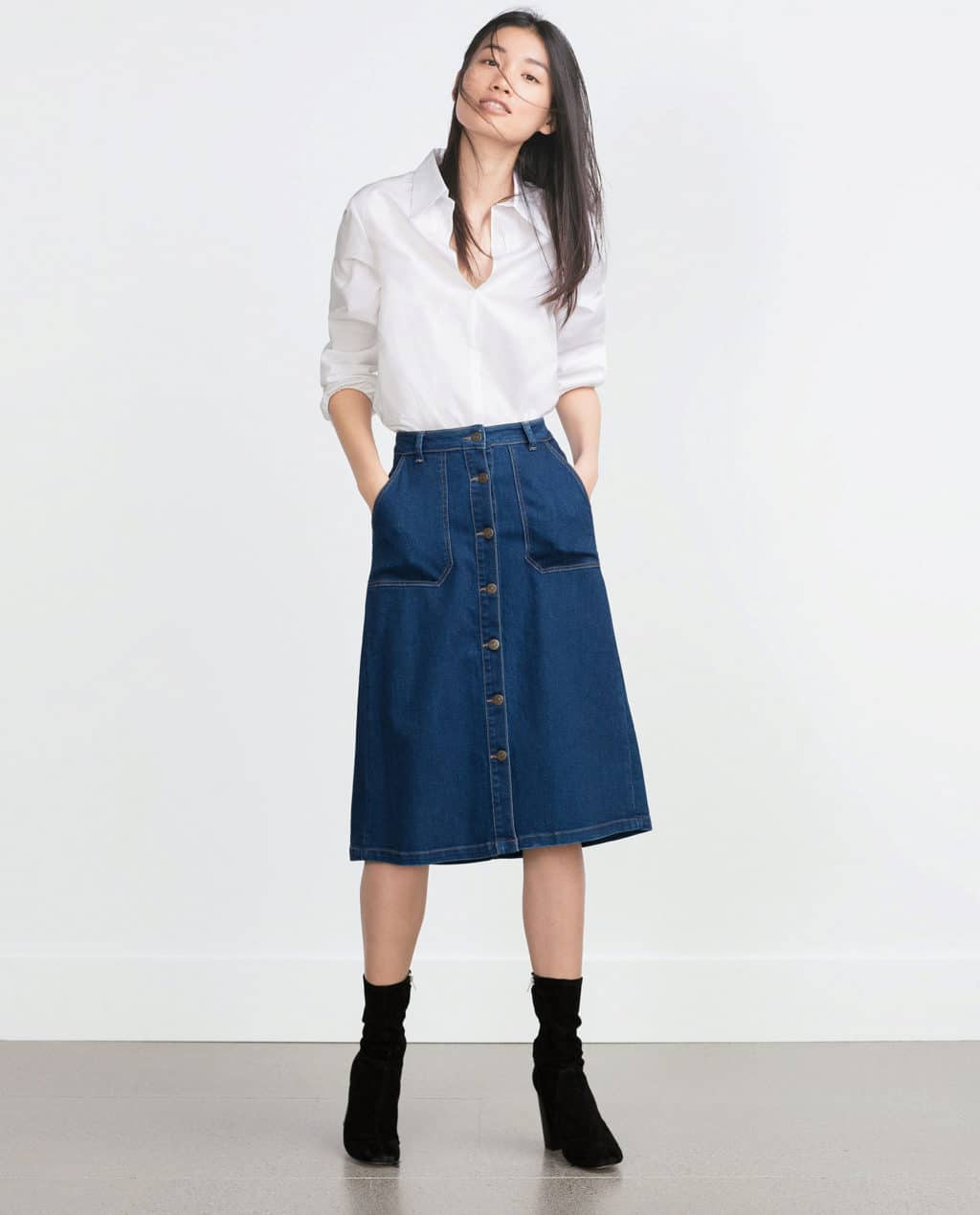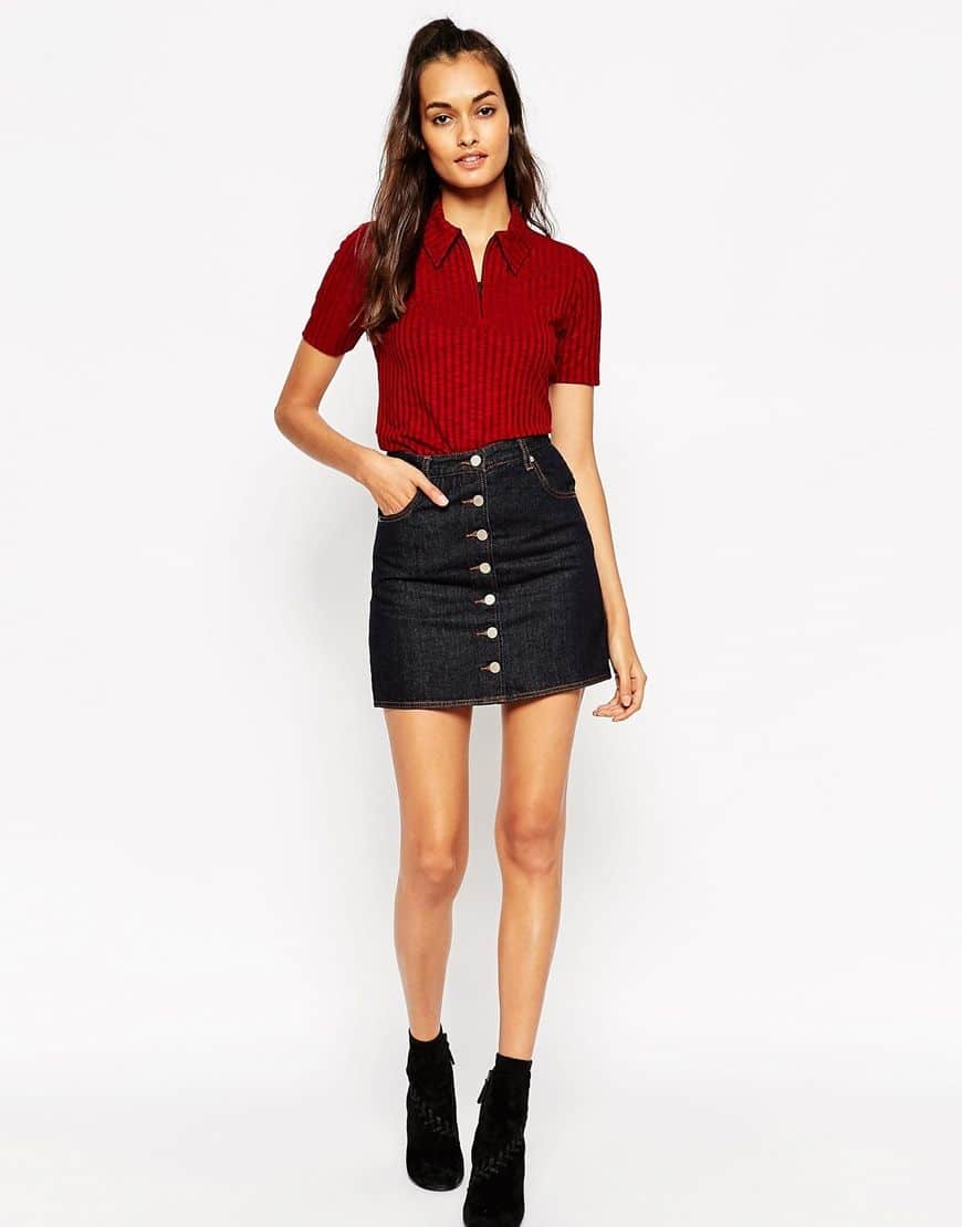 The denim a-line skirt is very practical. Of course, you can’t put it on work where the dress code works, but it is perfect for you for other events.