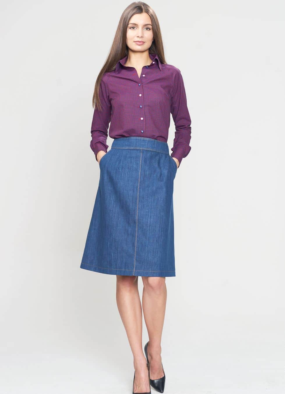 The blue color of denim goes well with many things without highlighting them. And the different style of a denim skirt-a-line allows you to wear any blouse under it, whether it is a strict style of a blouse or a light, seductive T-shirt.