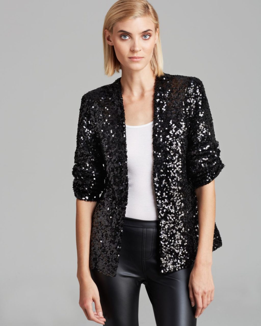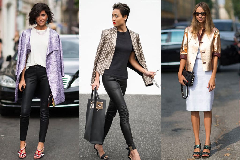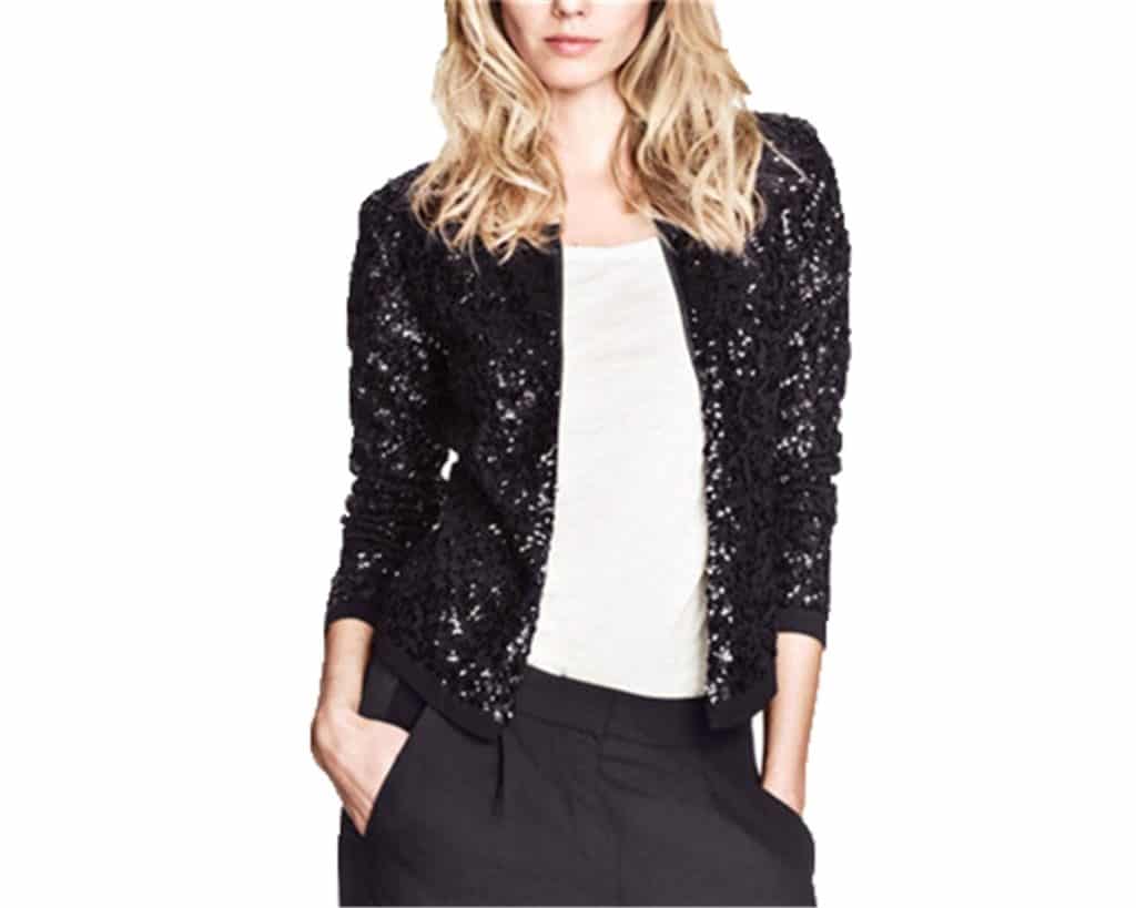 Going to a party? Wear a shiny jacket under leggings or jeans. You can also choose a plain dress. Your jacket with sparkles can be of any color, because the brighter the better. Because the purpose of a brilliant jacket is to attract more attention than an ordinary thing.