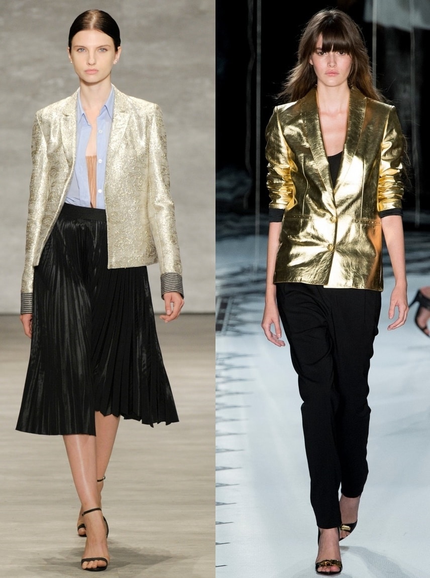 There are also jackets in gold, silver and metallic color. They are quite insidious in color and it is much harder for them to pick up related items. Basically it can be trousers in color or the same skirts. Such jackets are mainly chosen by shocking stars and artists.