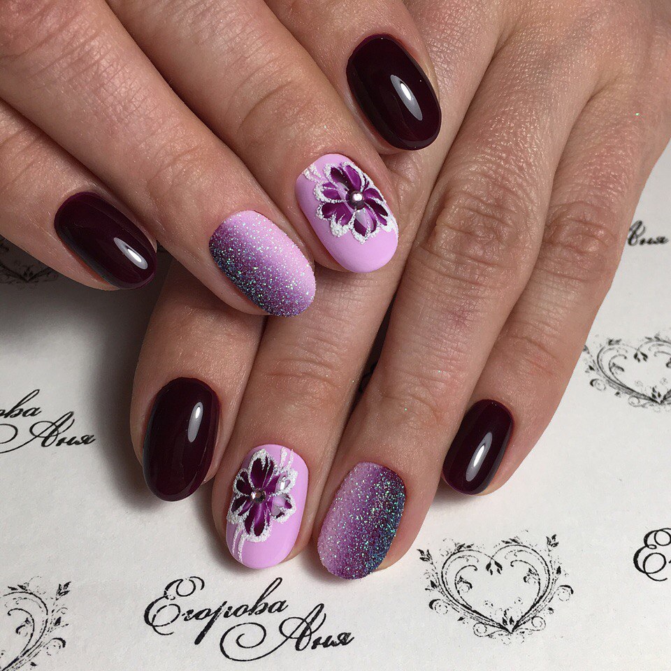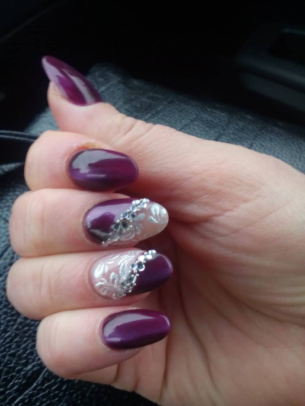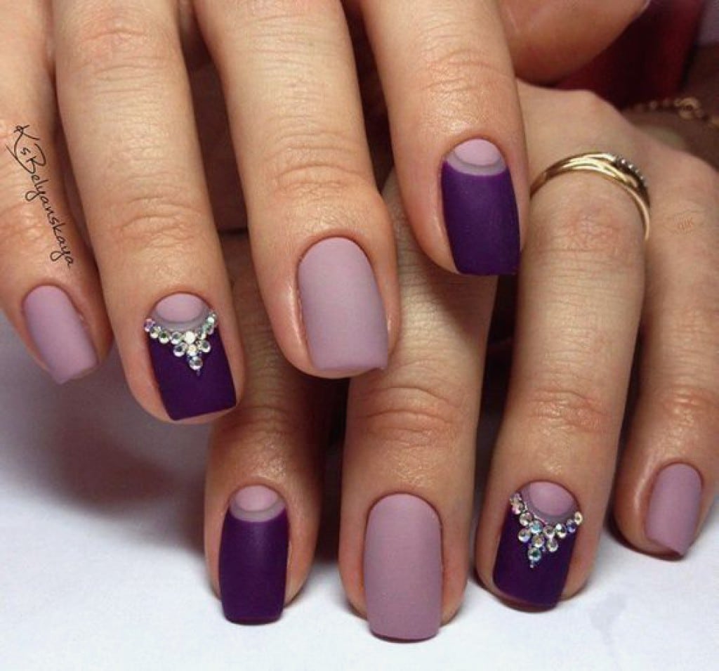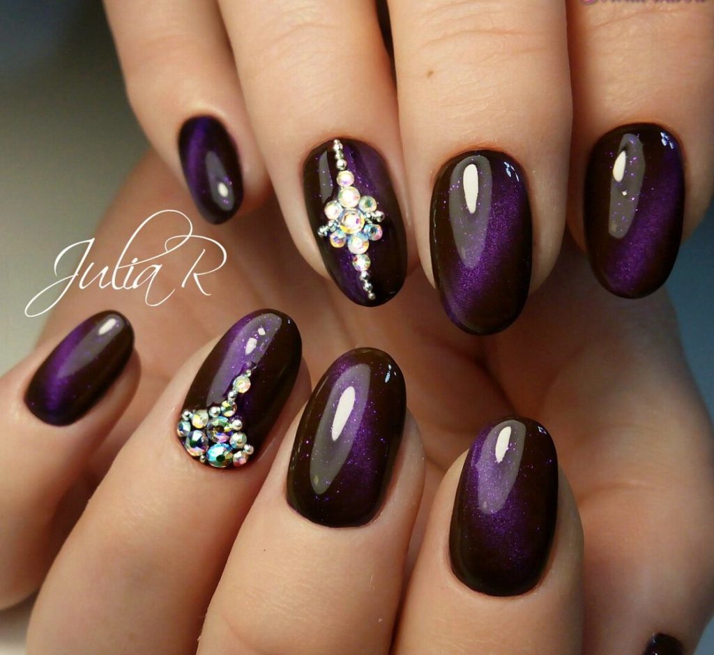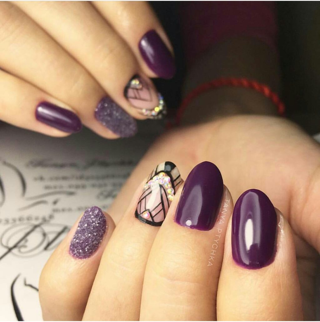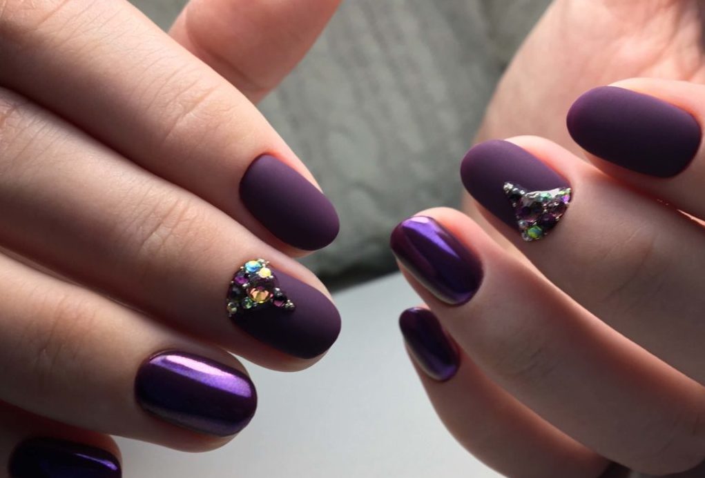 But, for us, the girls are not always satisfied with what the usual, standard execution technique offers. We want something new and interesting, and in such cases you can experiment. Mix the two techniques together, matte and gloss. Also apply drawings or rhinestones to your ring fingers. Use rubbing, foil, broken glass, rhinestones. Do not be afraid to plum color, add on one fingernail, varnish in another color. It can be a tone higher or lighter than the main plum color.