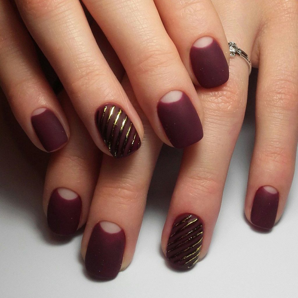 Plum manicure, made in a matte finish, looks elegant and not catchy. It will suit you well for festive, solemn events, as well as for ordinary everyday life. With such a coating is not ashamed to appear at work, and to conduct even the most serious negotiations.