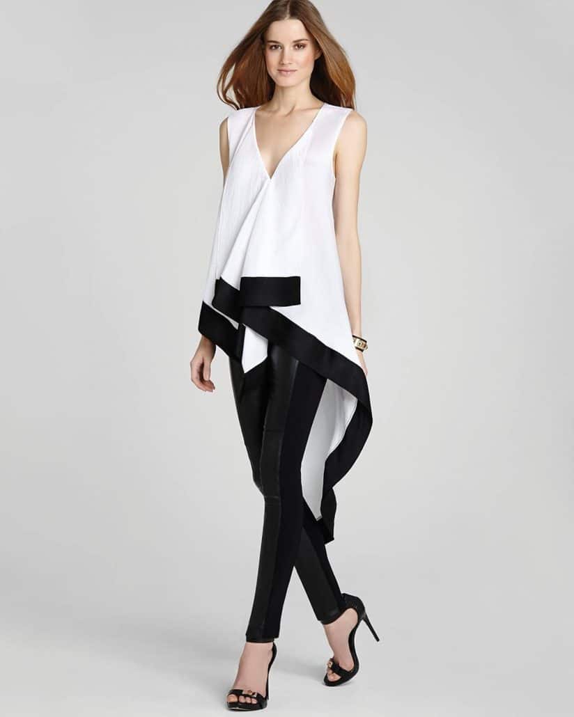 An interesting look is obtained by picking up a tunic of dark tones with white leggings and heeled sandals.