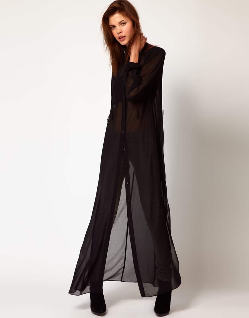 A chiffon dark tunic will look perfect in skinny jeans and high heel shoes.