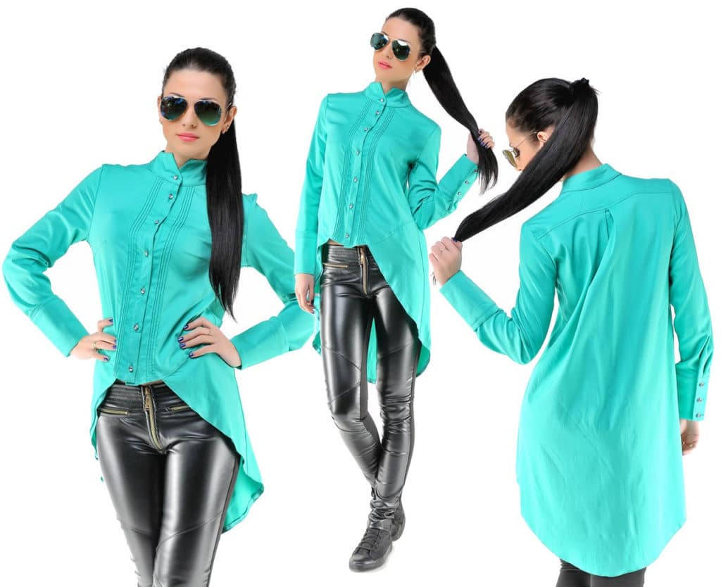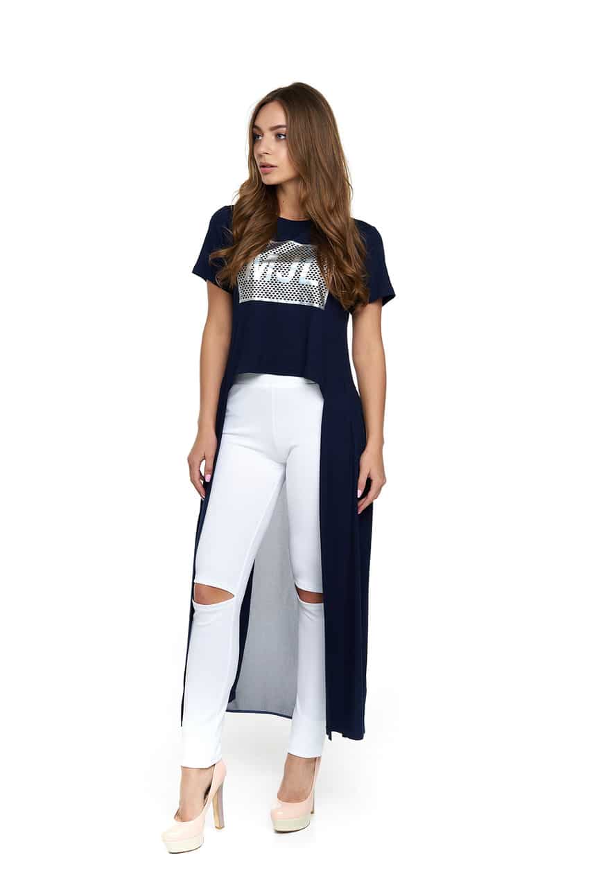 There are also asymmetric tunic designs. Such a design as an elongated tunic in the back looks original and extraordinary. Even with individual socks, it is appropriate to supplement it with high-heeled shoes or sandals.