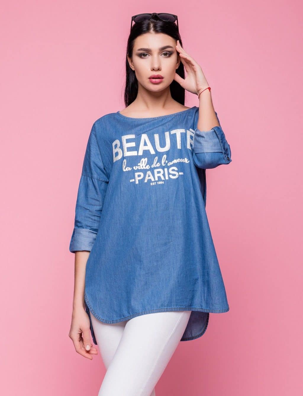 A light tunic of free cut is long to the middle of the thigh. Good to combine with pants, jeans and shorts.