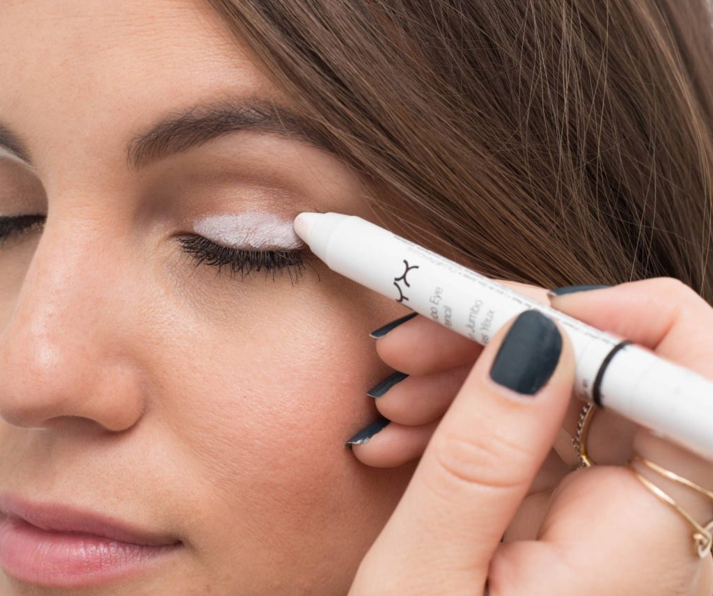 - We apply a white pencil to the entire movable eyelid and carefully blend it. Such an element is, as it were, the basis for the rest of the shadows. With it, the shadows will be brighter.