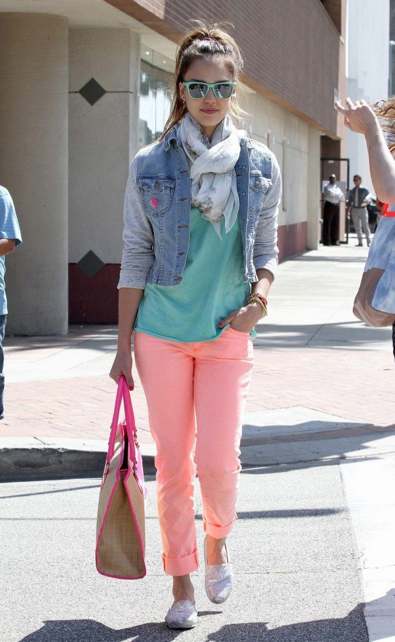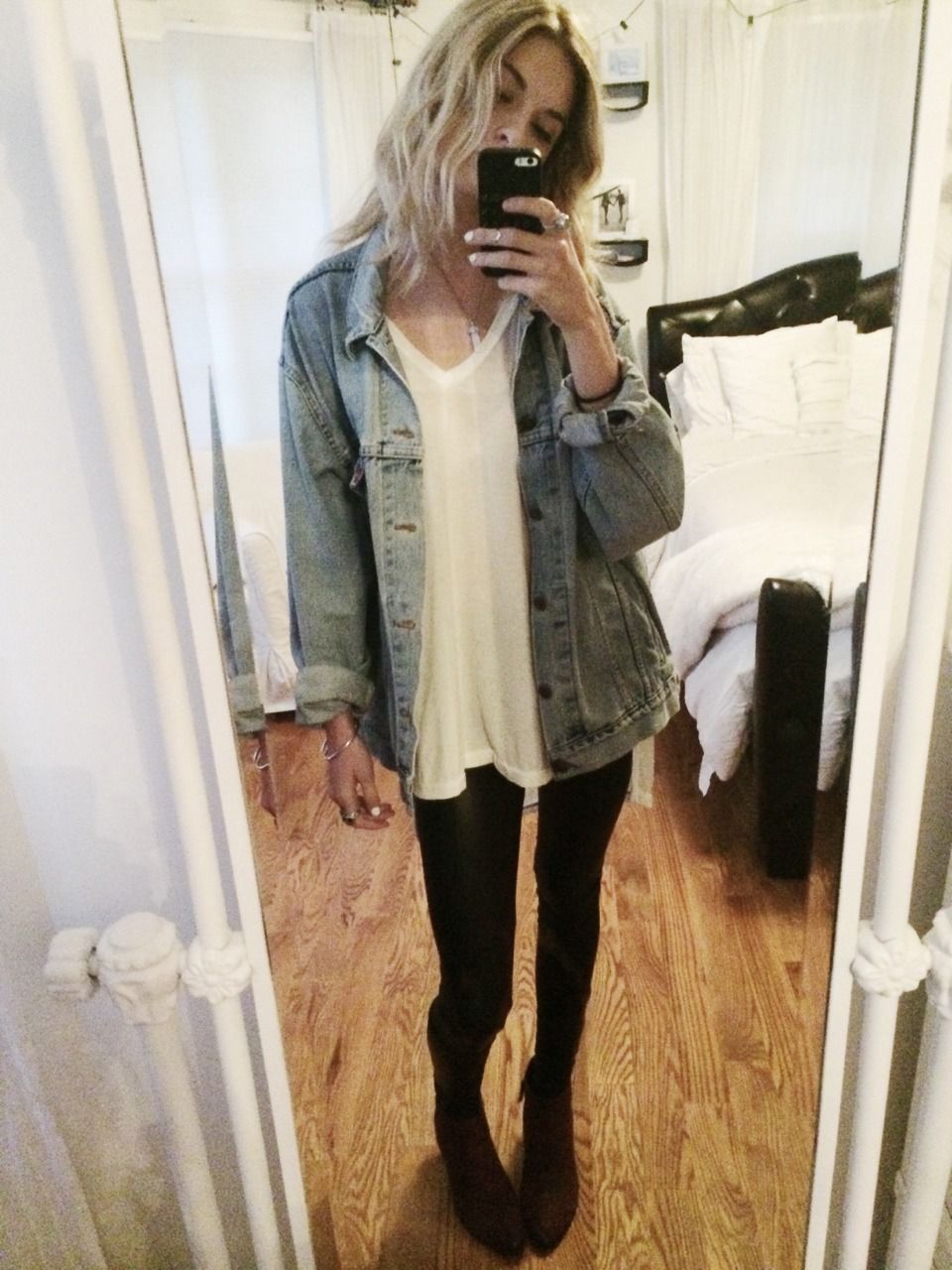 Also leggings. After all, with the help of them and a denim jacket, your image will turn out to be the most successful and stylish. In this combination, you can safely add silk or chiffon scarves, and choose white moccasins or sneakers as shoes.