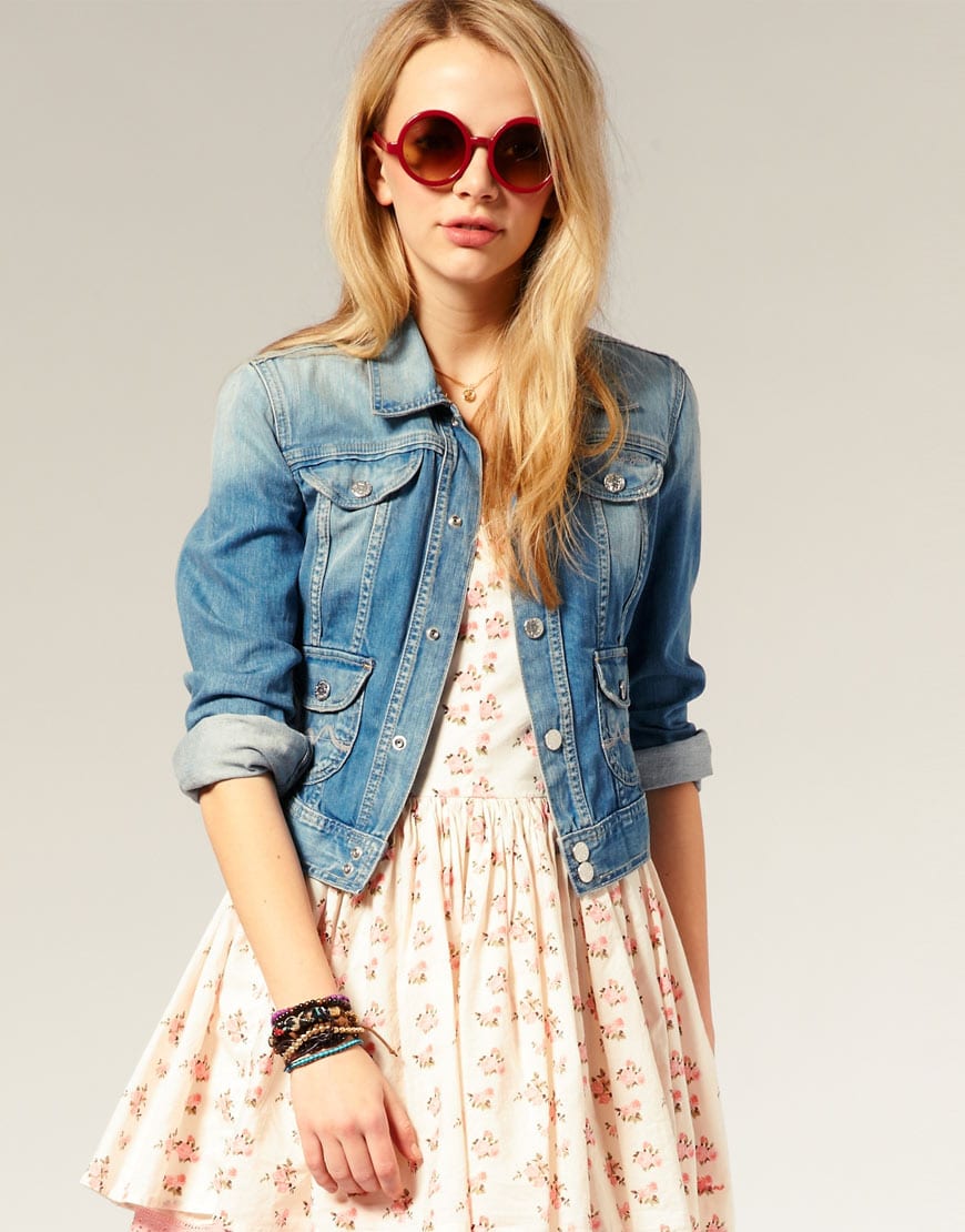 Under long models of dresses, stylists recommend choosing a short model of a denim jacket, similar to a vest. Such models are very convenient, because they do not constrain your movements, and your image with it turns out to be as successful as possible.