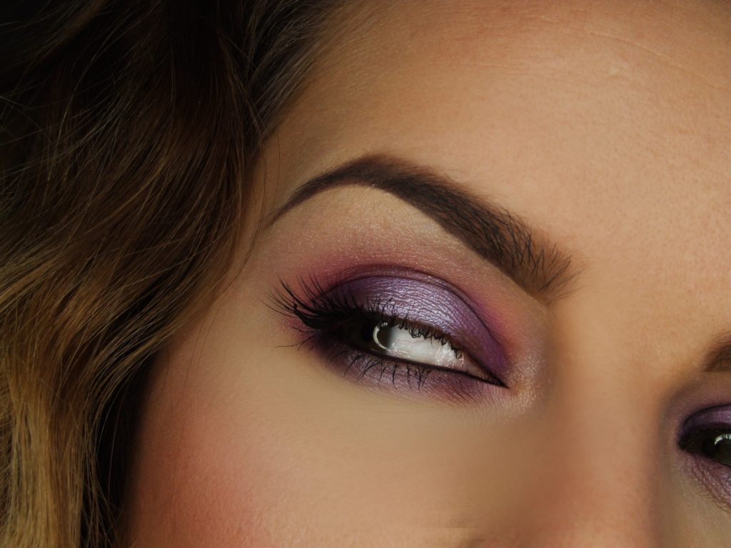 In this case, purple shadows are usually applied to the entire eyelid and slightly darken the outer corner. In the end, as always, we color the eyelashes with mascara and you're done.