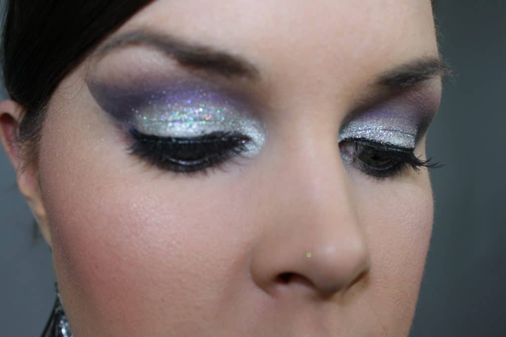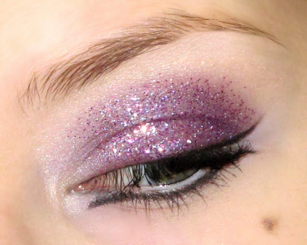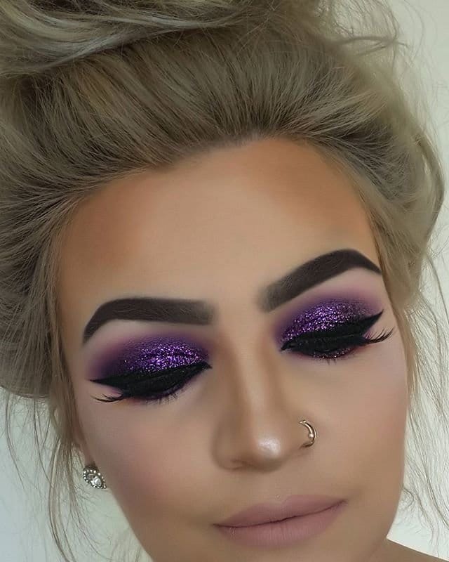 Glitter in combination with purple shades is an incredibly stylish solution. Sequins can be applied as the final stage of makeup or immediately use the shadows with sparkles.