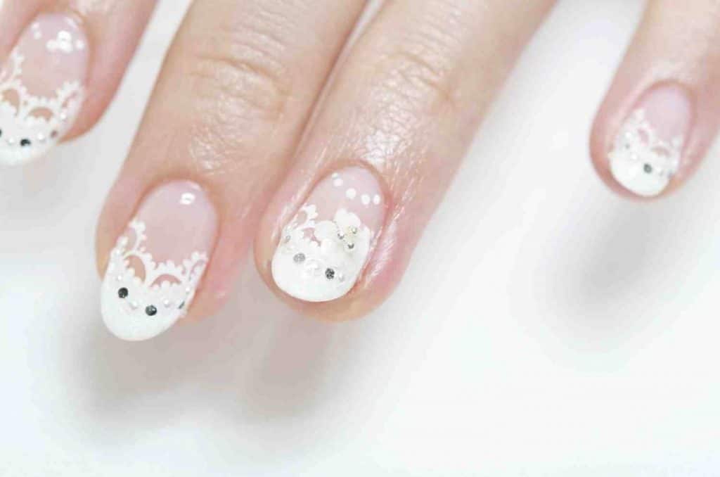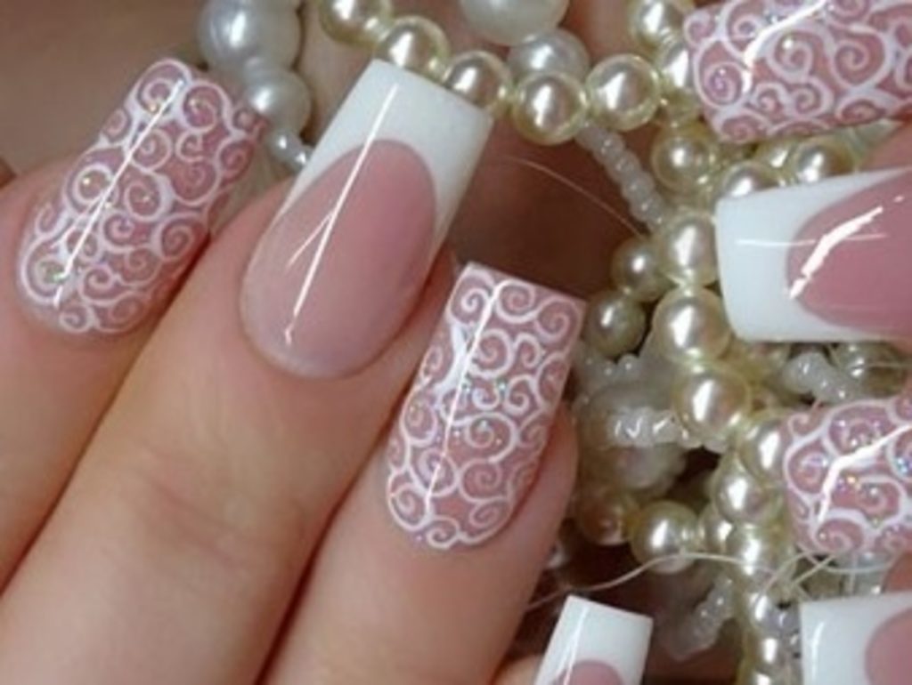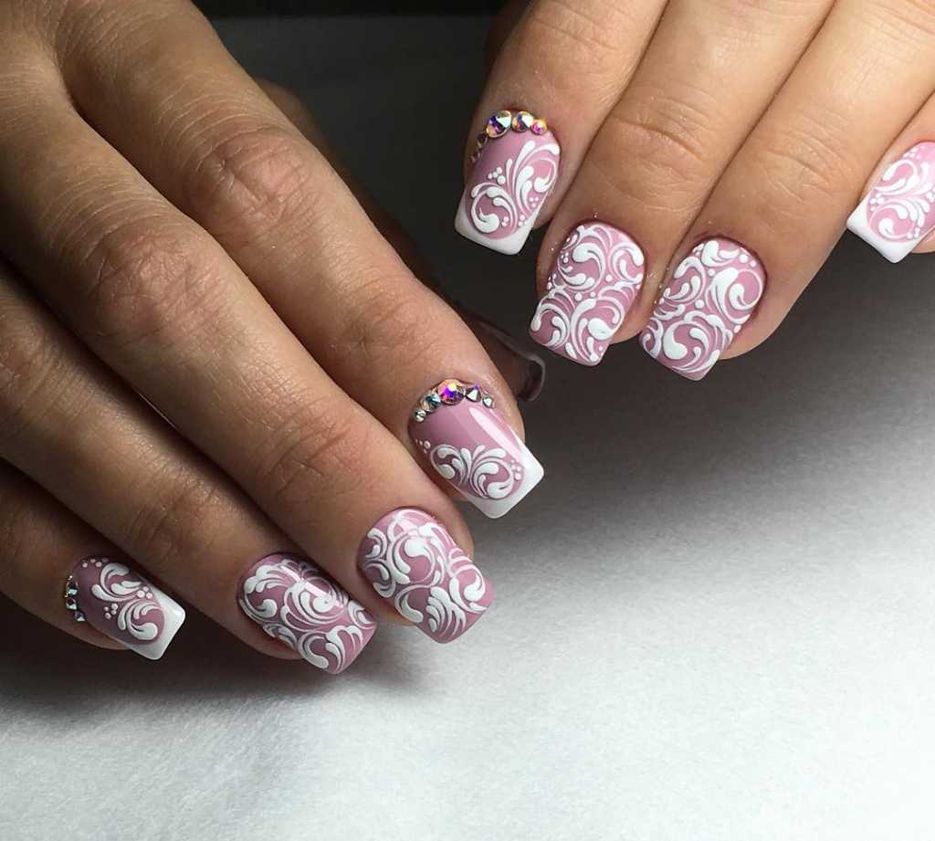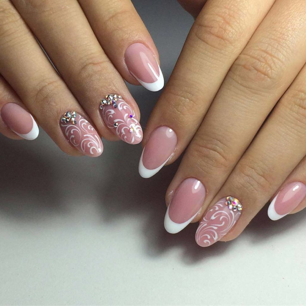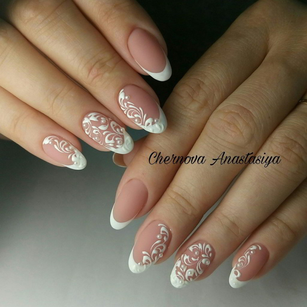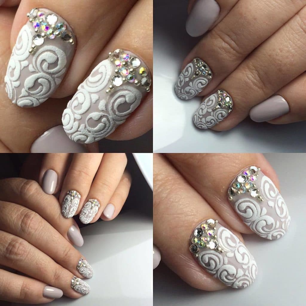 In a wedding manicure, the nails are covered with a complex openwork pattern, which can be located on the entire nail plate, or in the smile zone. Most often it is decorated with rhinestones or decorative stones.