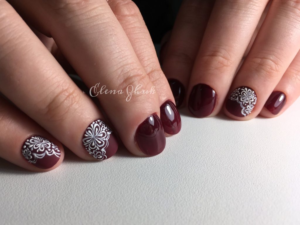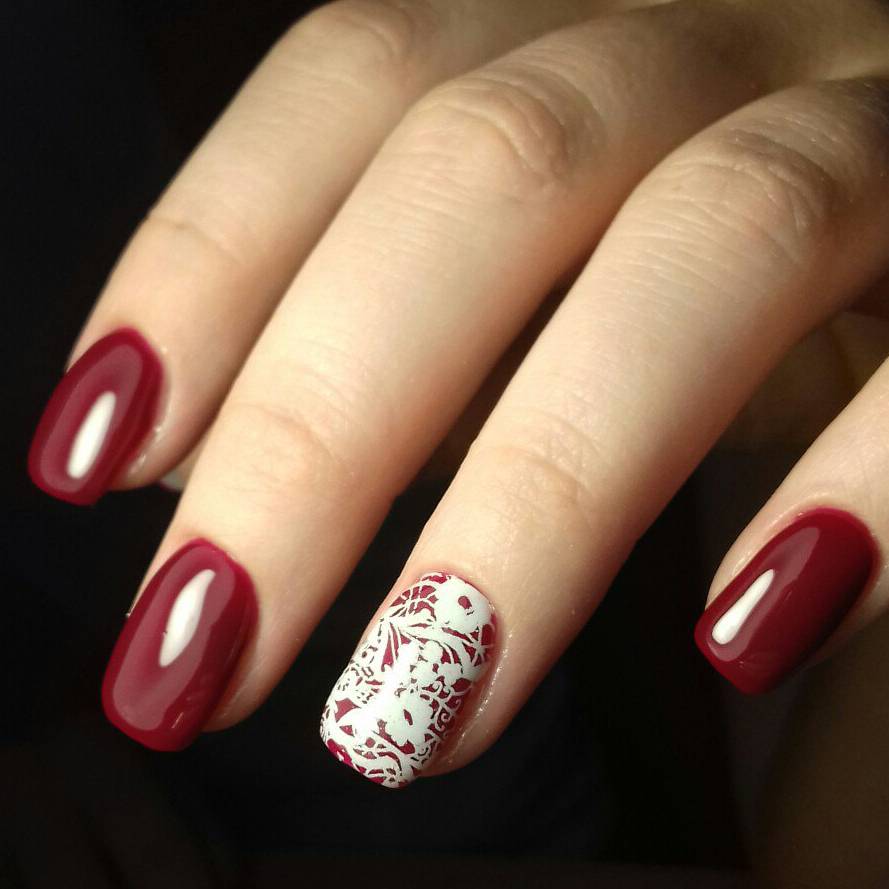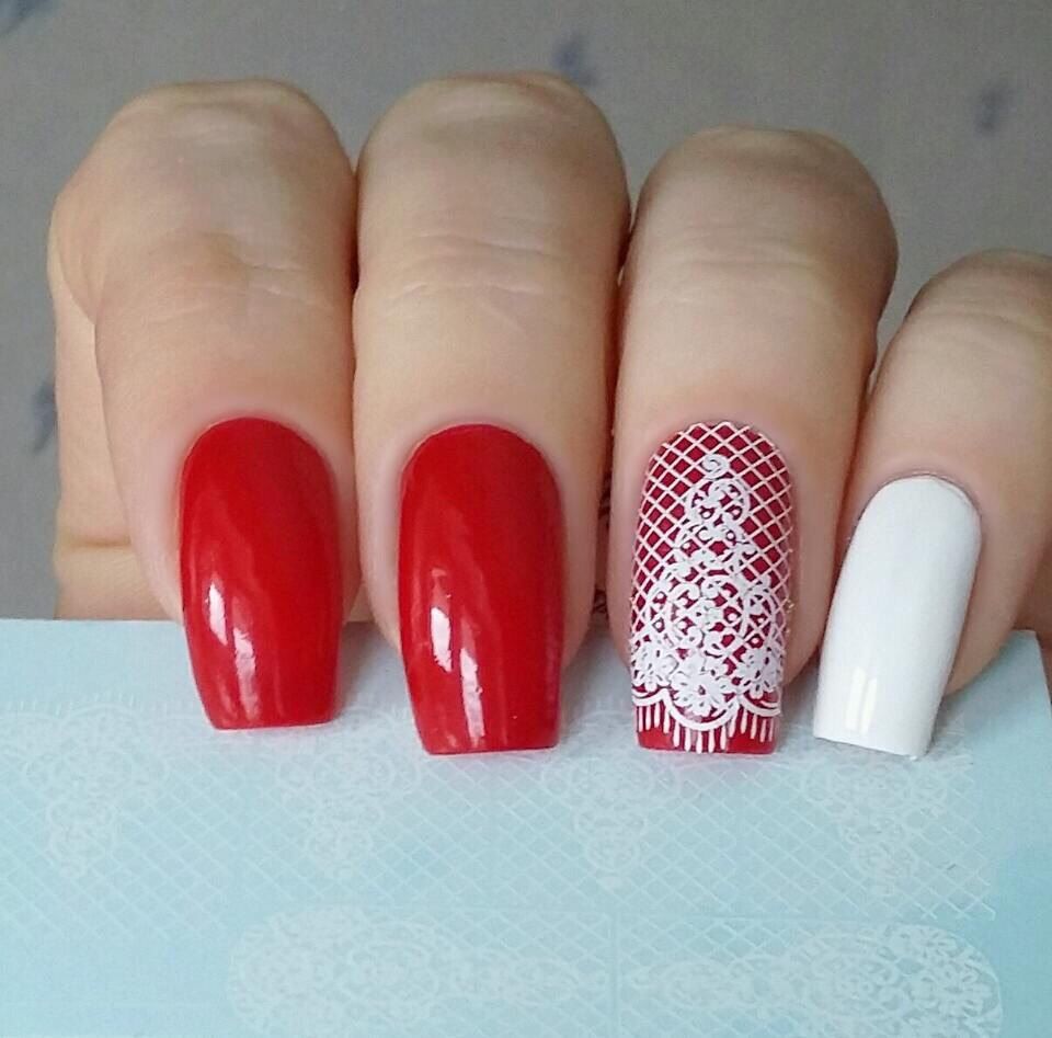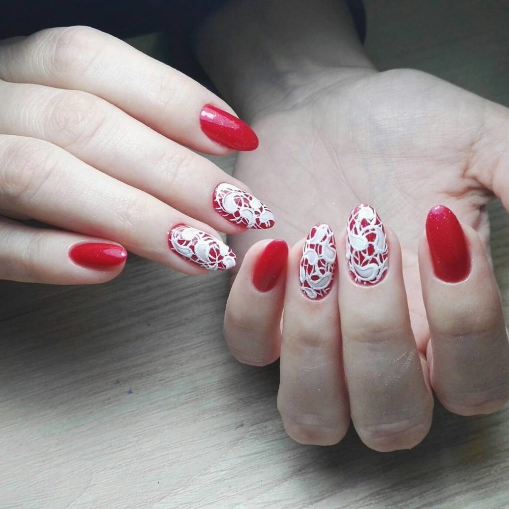 If you do not have a classic white dress, but his other color scheme, then pick up a wedding manicure with a lace in the red version.You can still plain white, complement laced drawings in black.