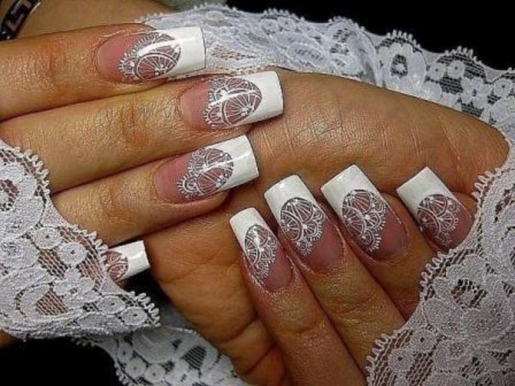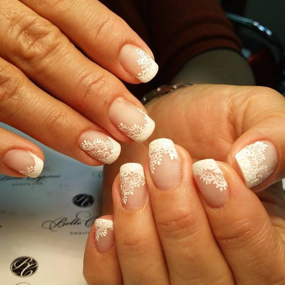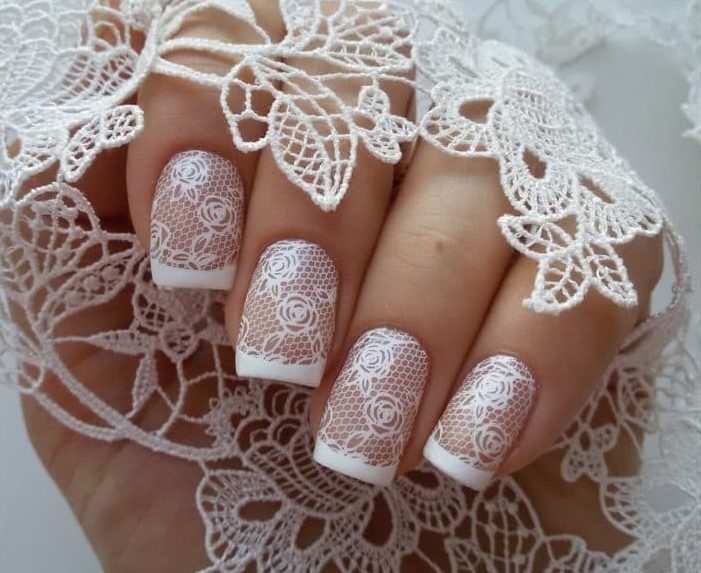 Most often, girls for the most important event in their life choose a manicure with a lace. Basically, this look suits French manicure, which goes well with a white wedding dress.