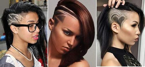 These haircuts are for bold and very modern women. Shaving can be done on one temple or both, as well as on the back of the head. The shaved area can be decorated with a pattern, there are several options: