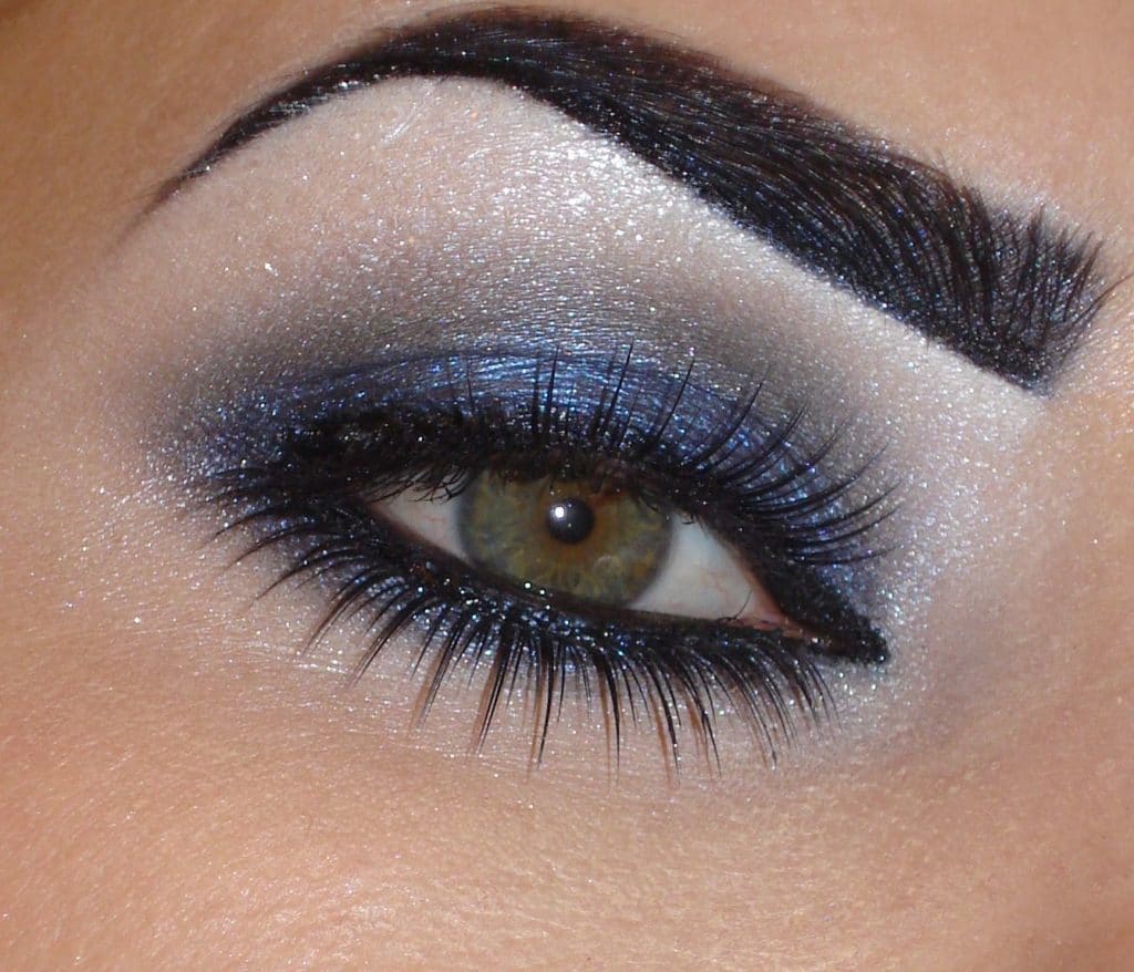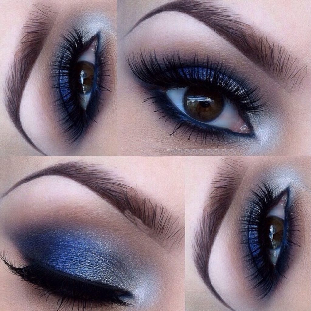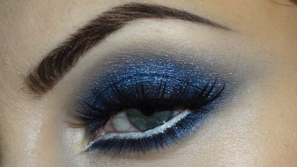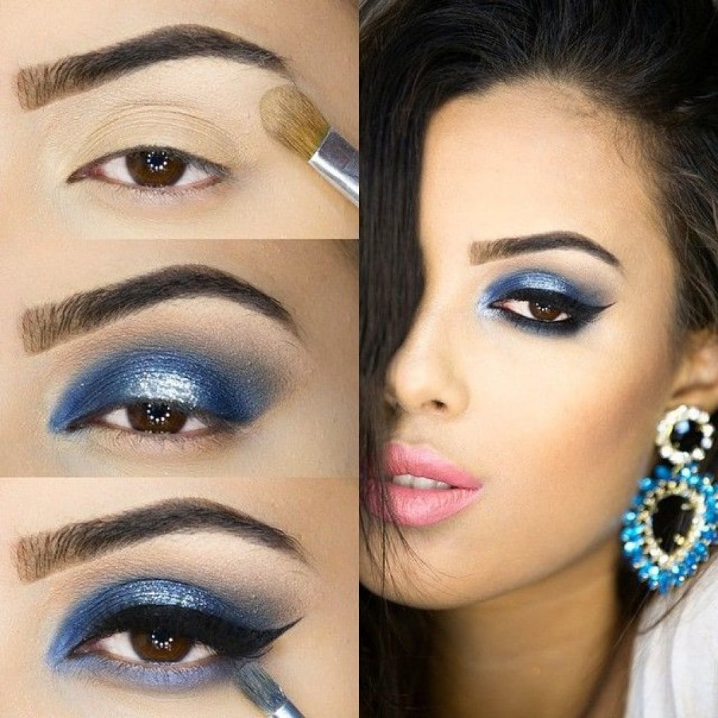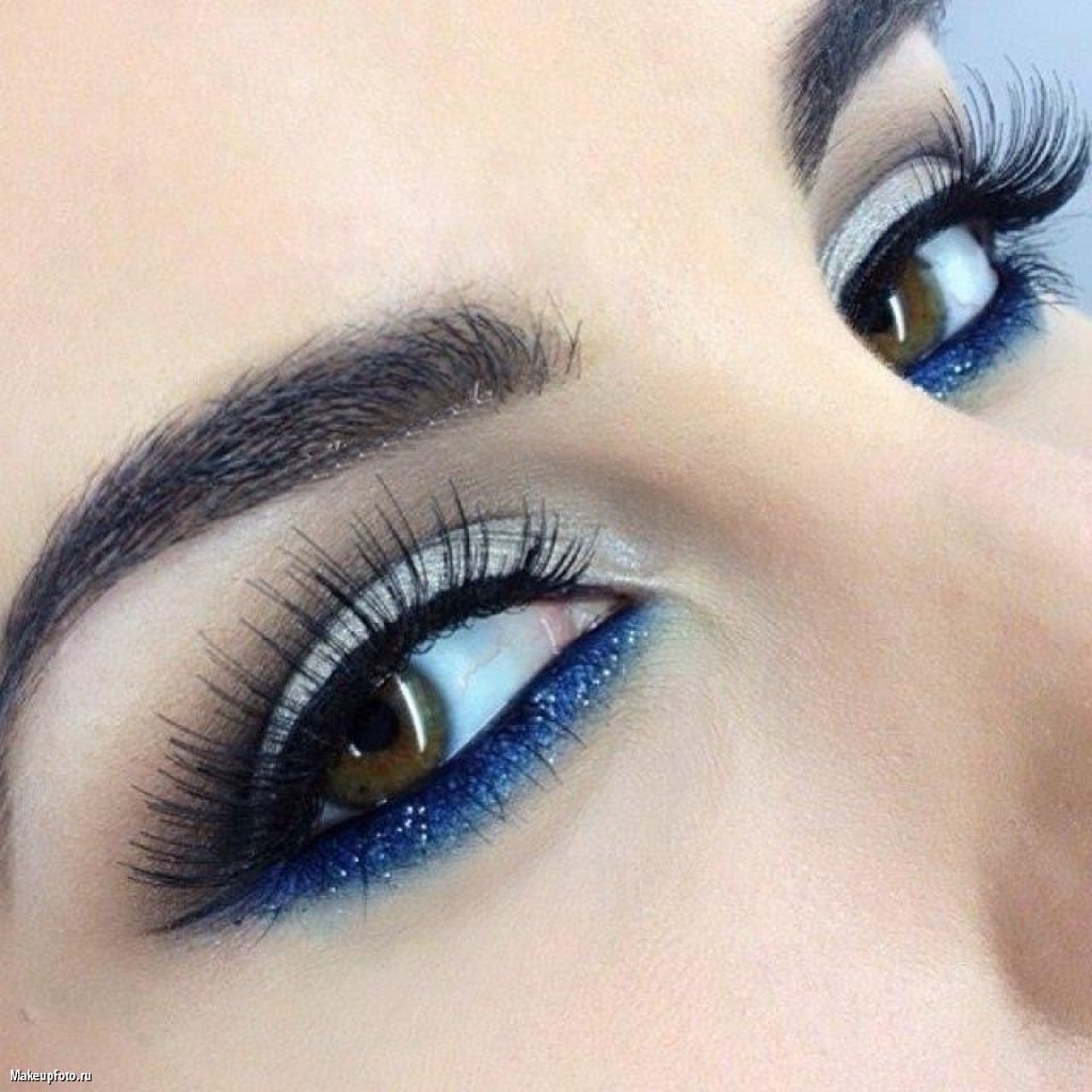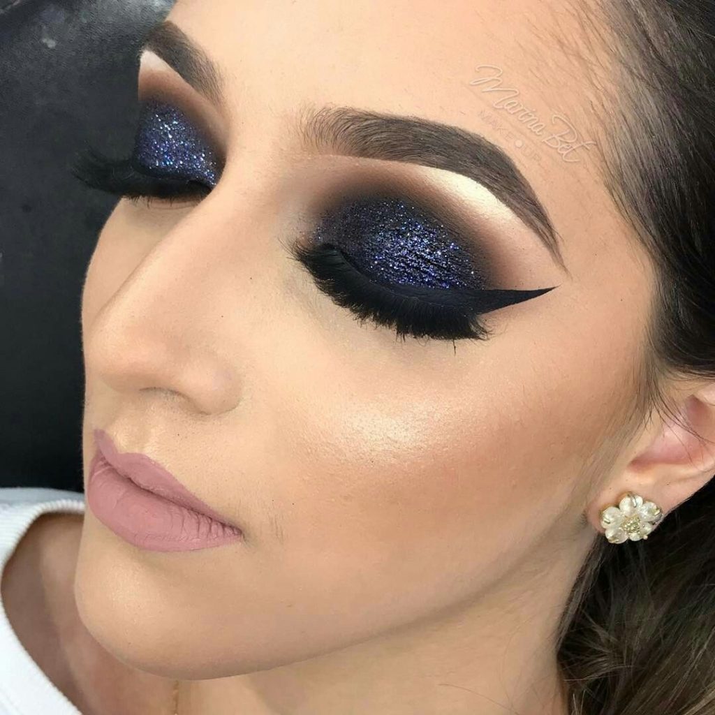 No makeup in saturation is comparable to makeup in the style of smokey. Blue shades in this makeup use the darkest, almost black. For a stunning effect on top of blue shadows, you can add a shiny pigment to the center of the eyelid.