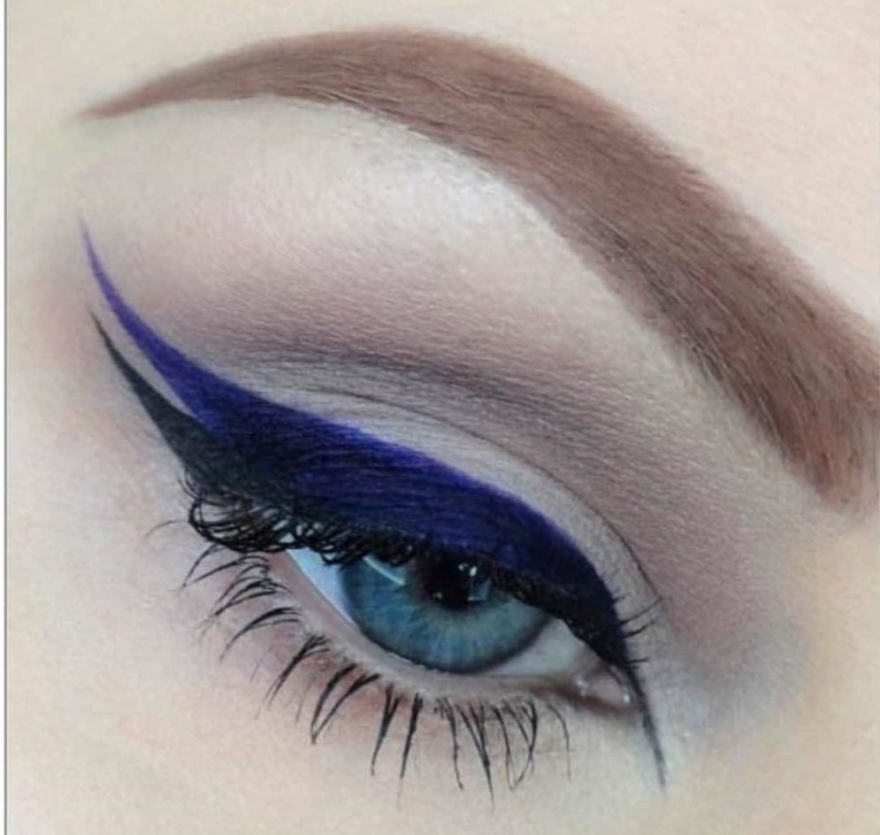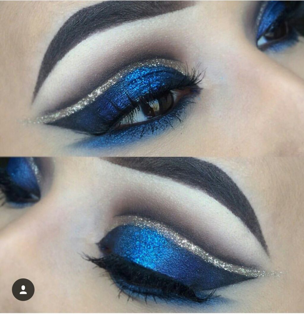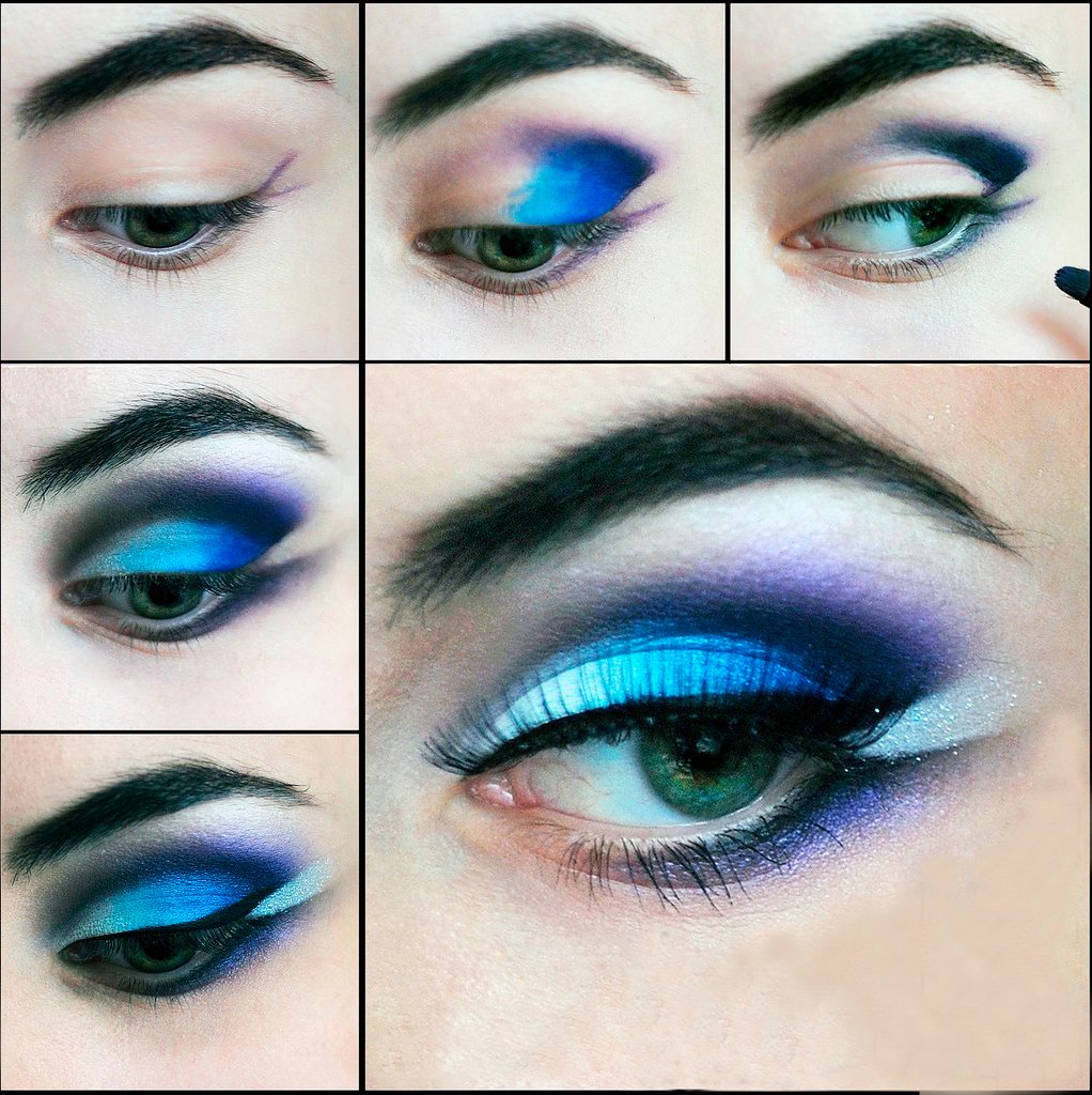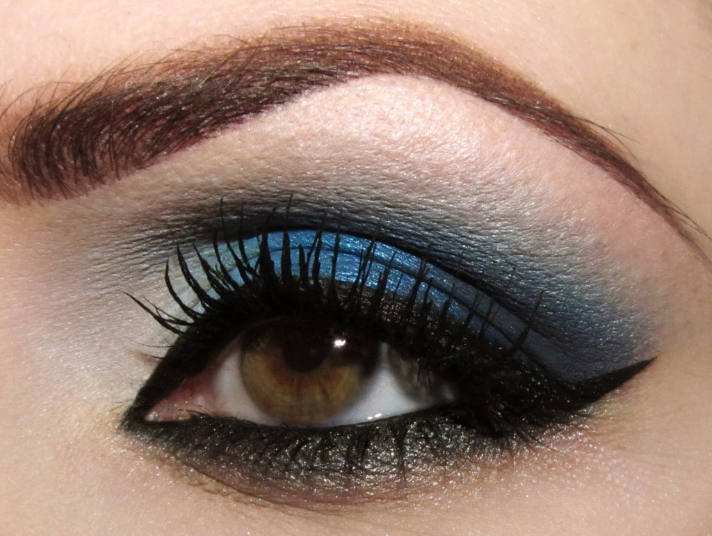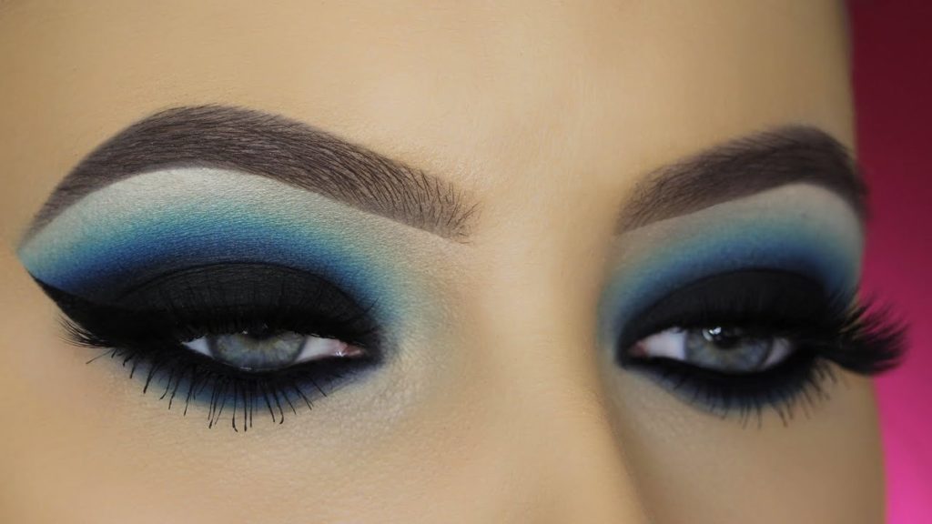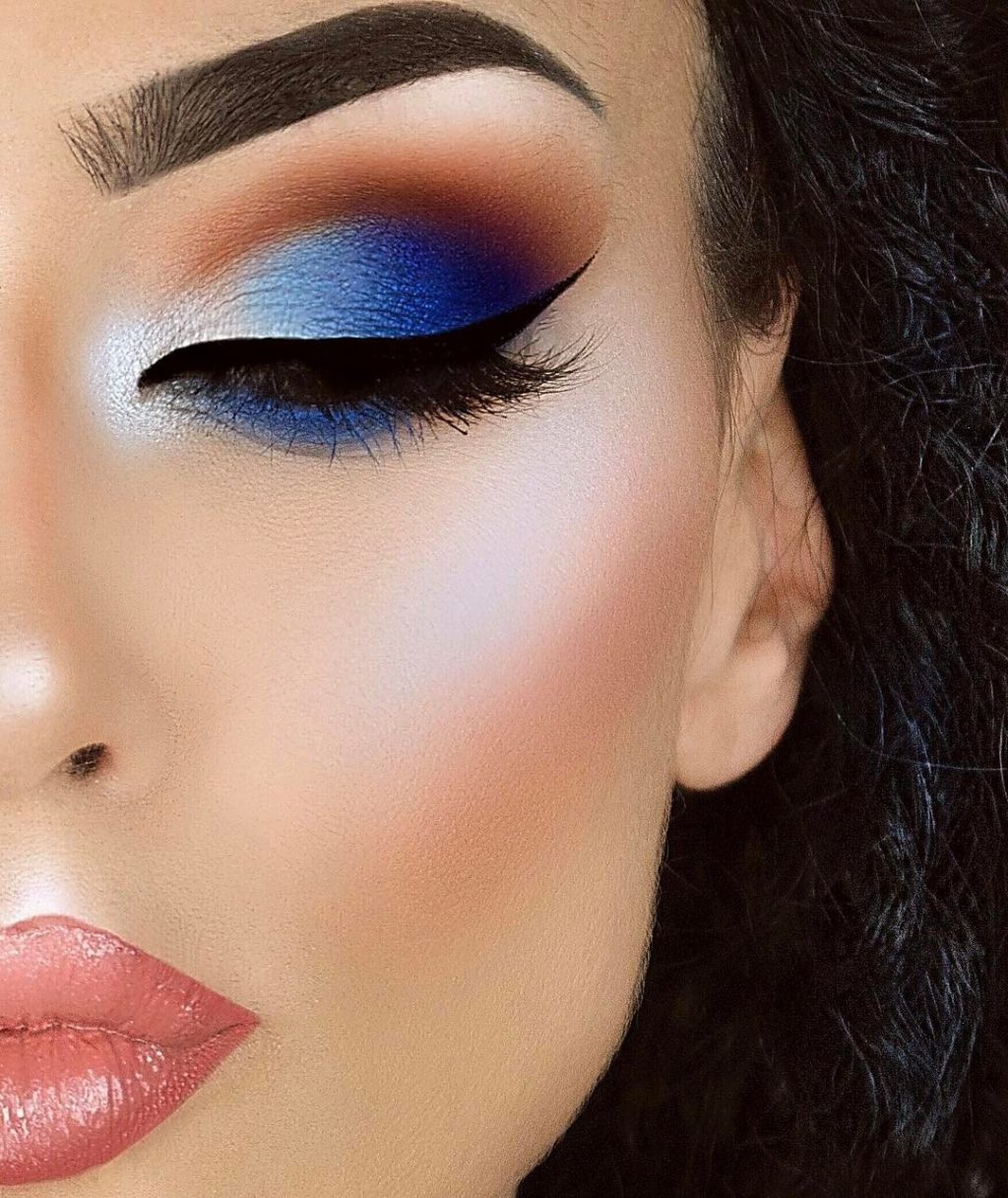 A make-up technique such as cut crease is presented in a smoky version (shading) on the upper eyelid and summing up the lower eyelid and mucous membrane. A particular feature of makeup is the traced fold of the eyelid. This makeup in blue looks great. The fold is drawn with a pencil or heavily pigmented shadows. In blue makeup, such a fold will look better in brown and gray.