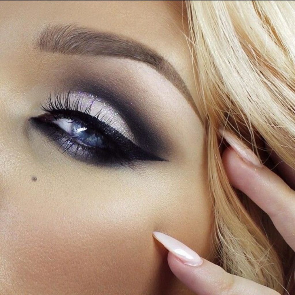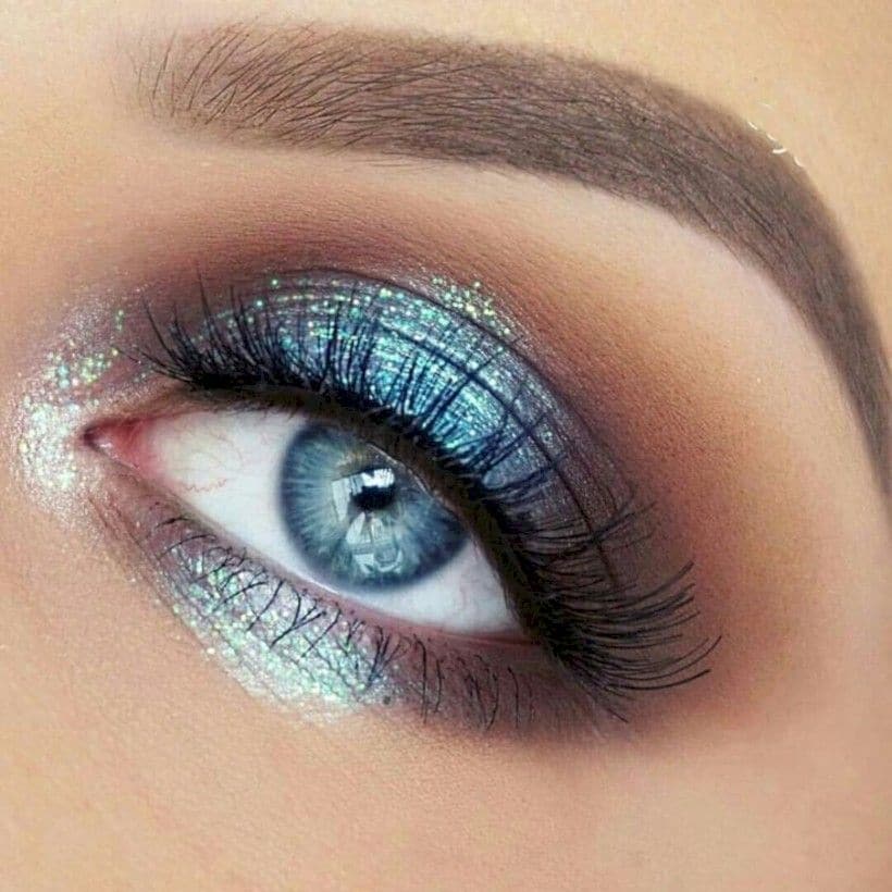 Sparkles perfectly emphasize blue eyes. More often use sparkles blue, silver, of blue, beige colour.