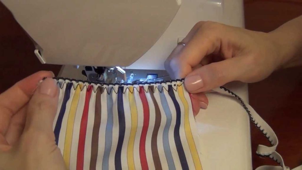 For stitching gum the easiest and fastest way is a zigzag stitch. Such a stitch will help you sew an elastic band into a product from a stretching fabric.