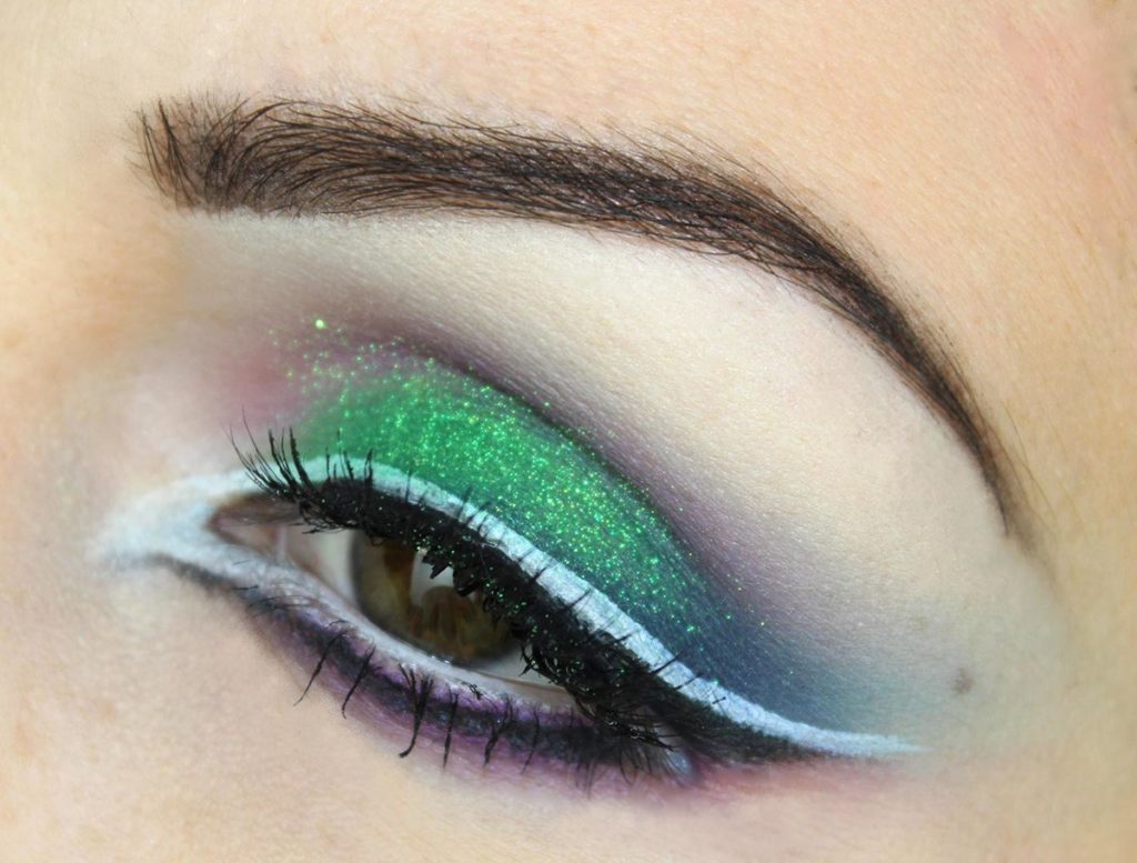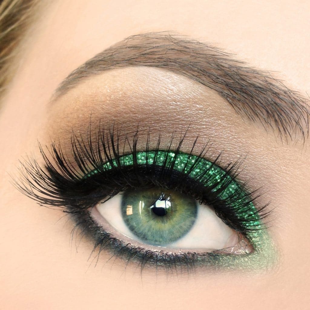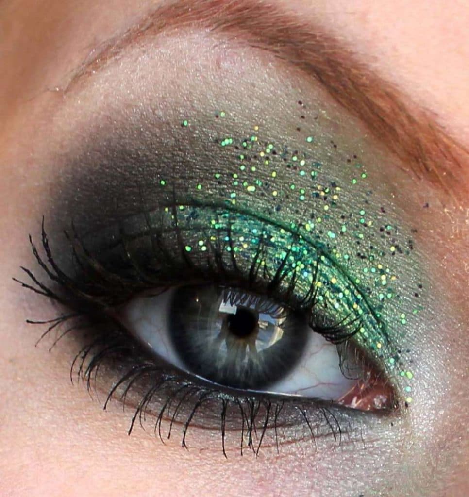 For green eyes, you can always do an unusual, bright and rather extravagant makeup. Such makeup involves the use of a large number of sparkles, rhinestones, the brightest colors of the shadows, green ones are especially suitable.