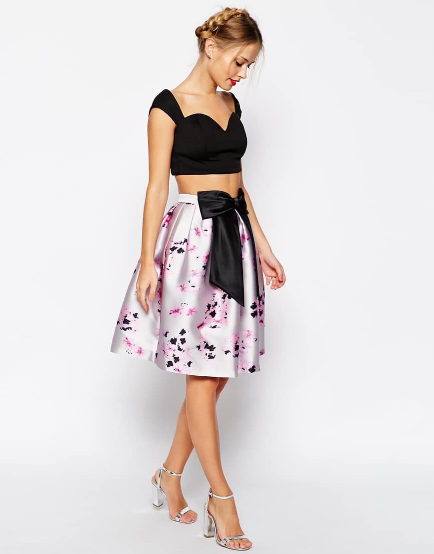 For example, a skirt with a floral pattern in combination with a top, your bow will turn out bright and sexy. But the pattern must be brighter than the background to stand out in contrast. Complement the image of shoes or sandals with heels.