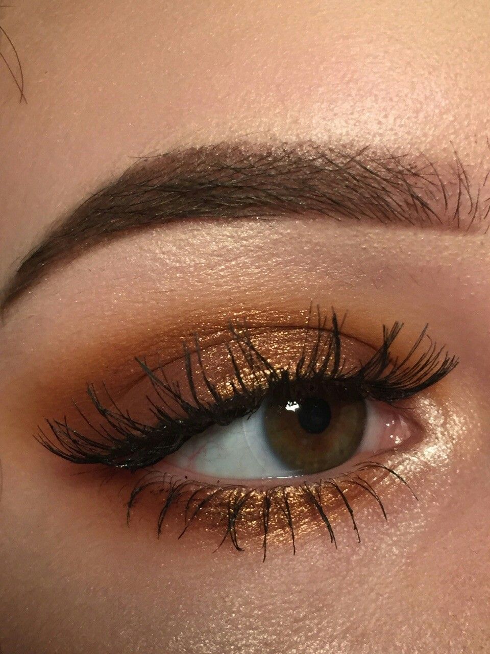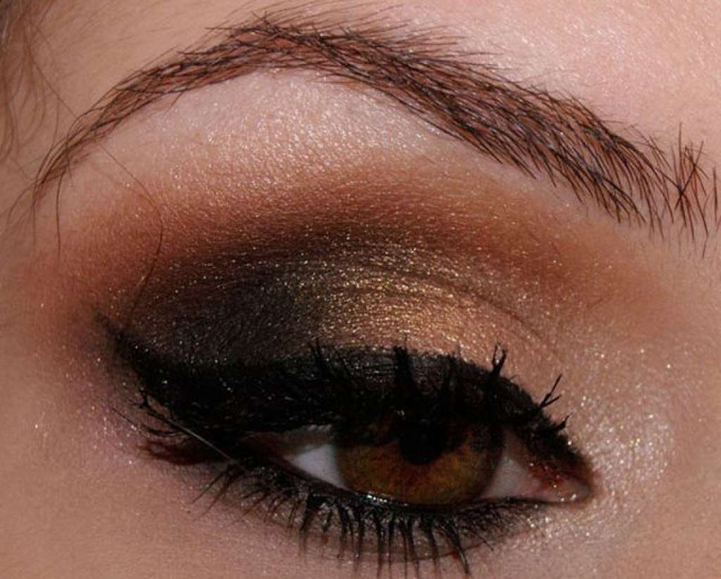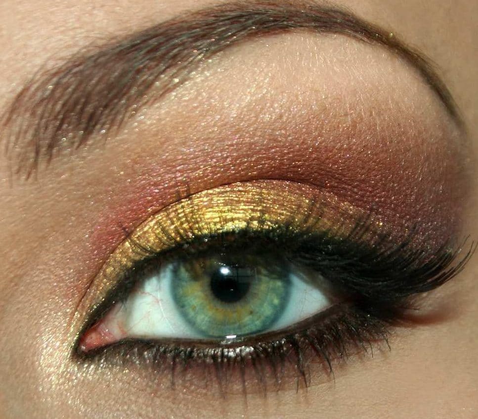 In the spring of 2024, gold is considered a fashionable color. Eye makeup made in this color always looks festive and beautiful. Such shadows are perfectly combined with black arrows and richly tinted eyelashes.