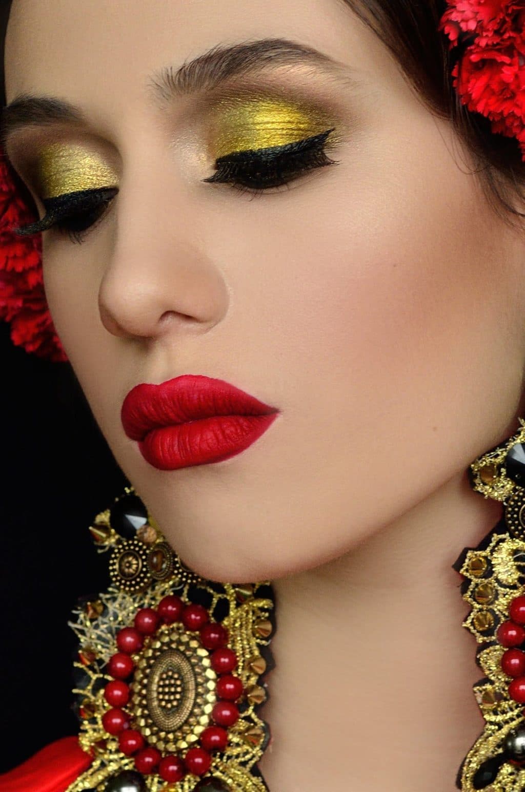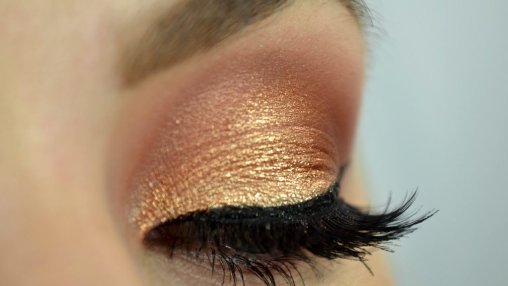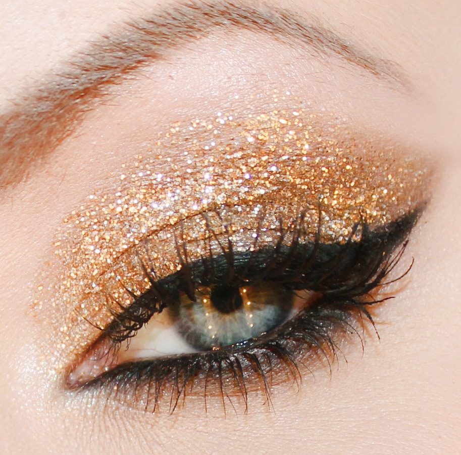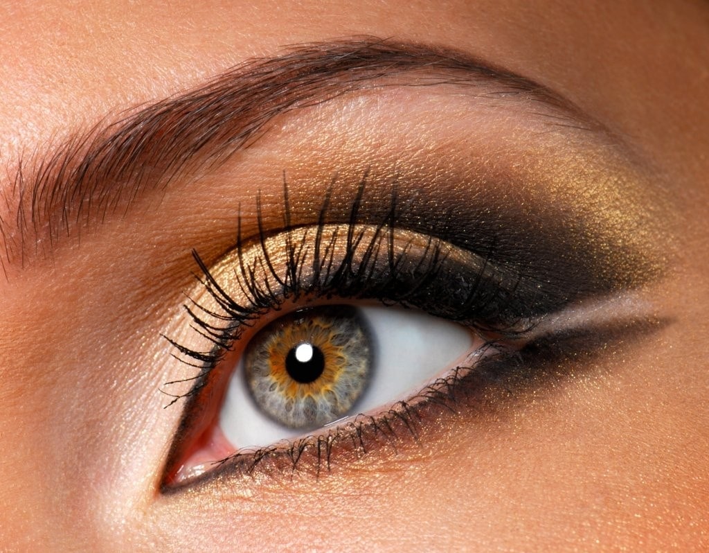 In the spring of 2024, gold is considered a fashionable color. Eye makeup made in this color always looks festive and beautiful. Such shadows are perfectly combined with black arrows and richly tinted eyelashes.