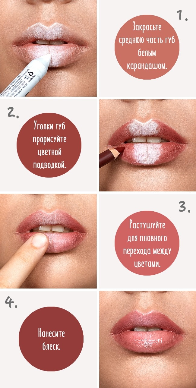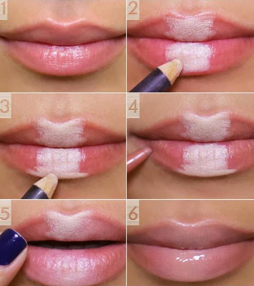 To make your lips more sensual, use a white pencil or colorless gloss. In the case of a pencil, you should draw it along the central part of the lips, shading a little. Make up your lips with lipstick or gloss. Such a pencil will give your lips fullness and make them more sensual.