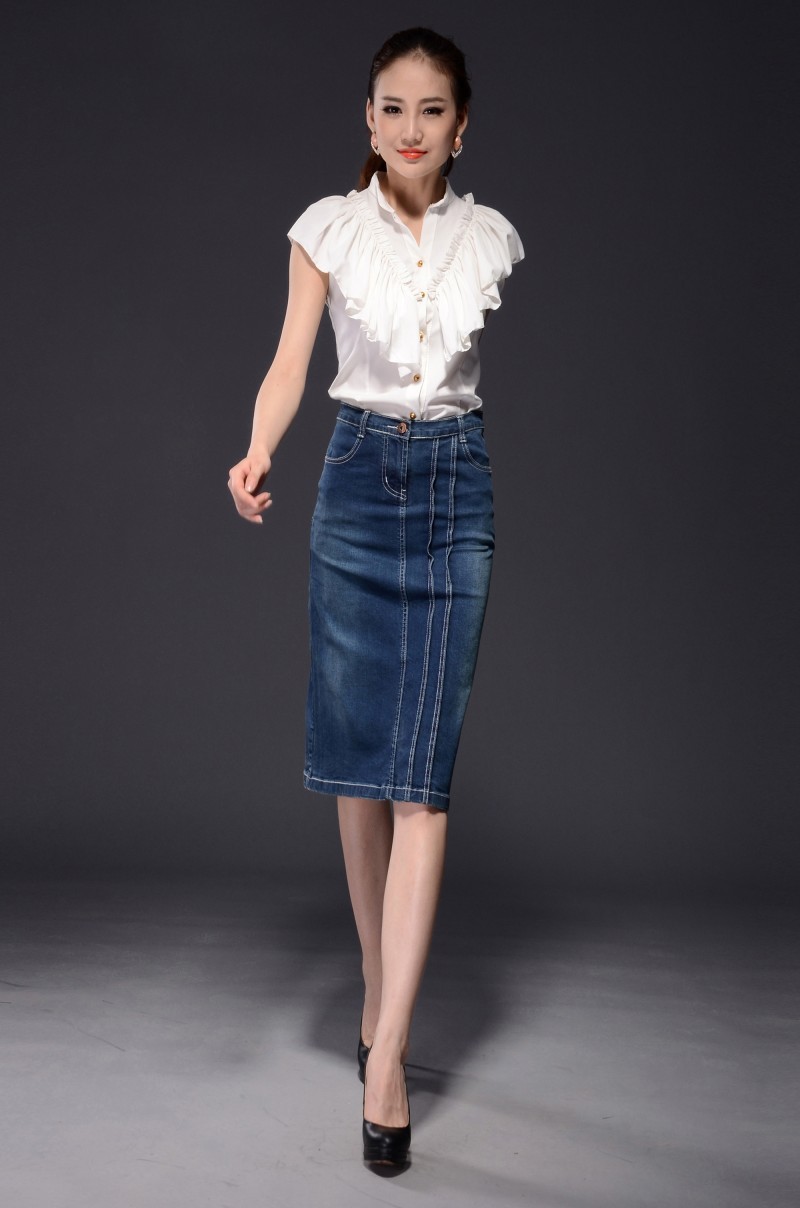 The combination of jeans style and pencil skirt design is comfort and elegance.