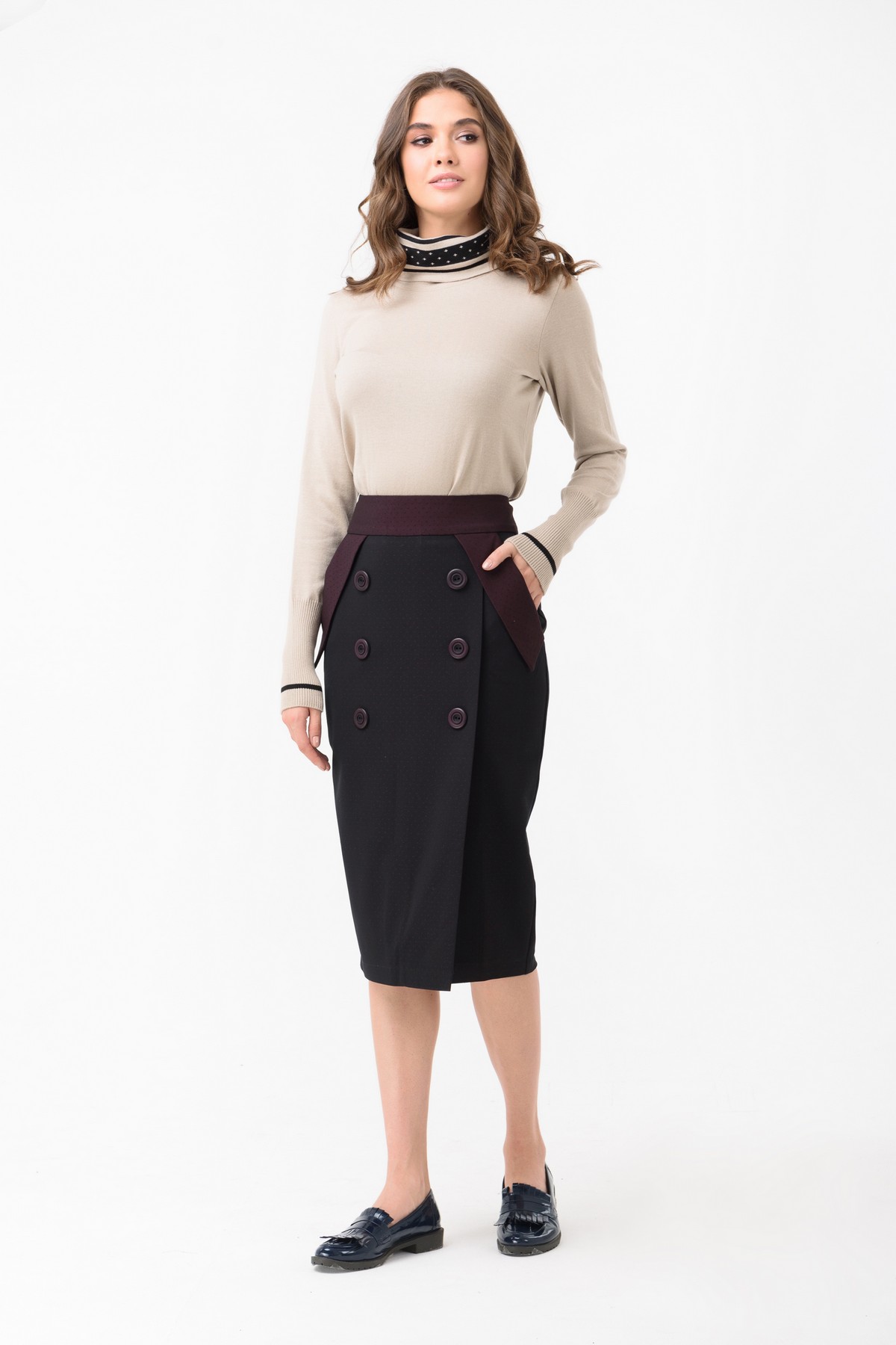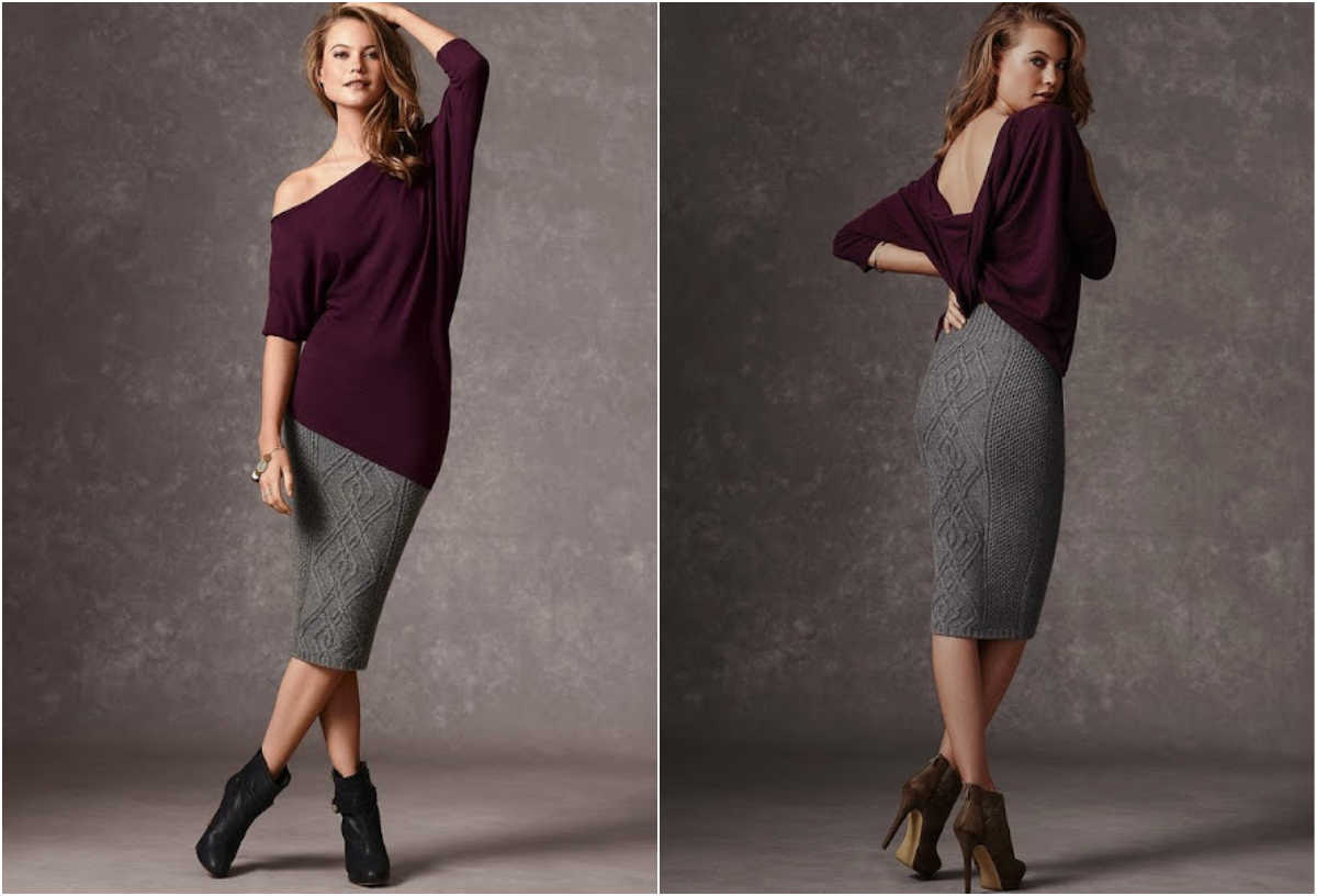 The dark shades of warm skirts are appropriate to combine with the light colors of sweaters and blouses.