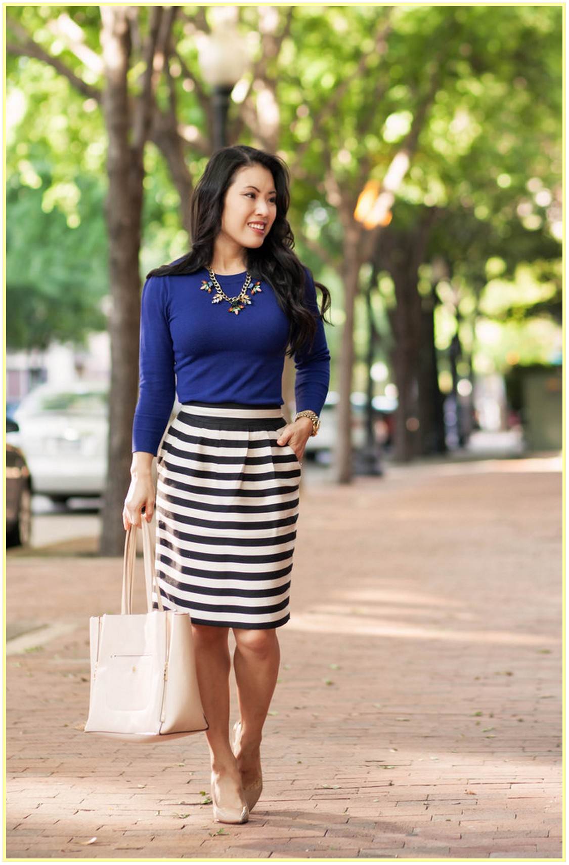 For a white skirt with black stripes, choose blouses of bright colors, red or blue. Also with a bright striped skirt, a blouse or tops in white shades will work well.