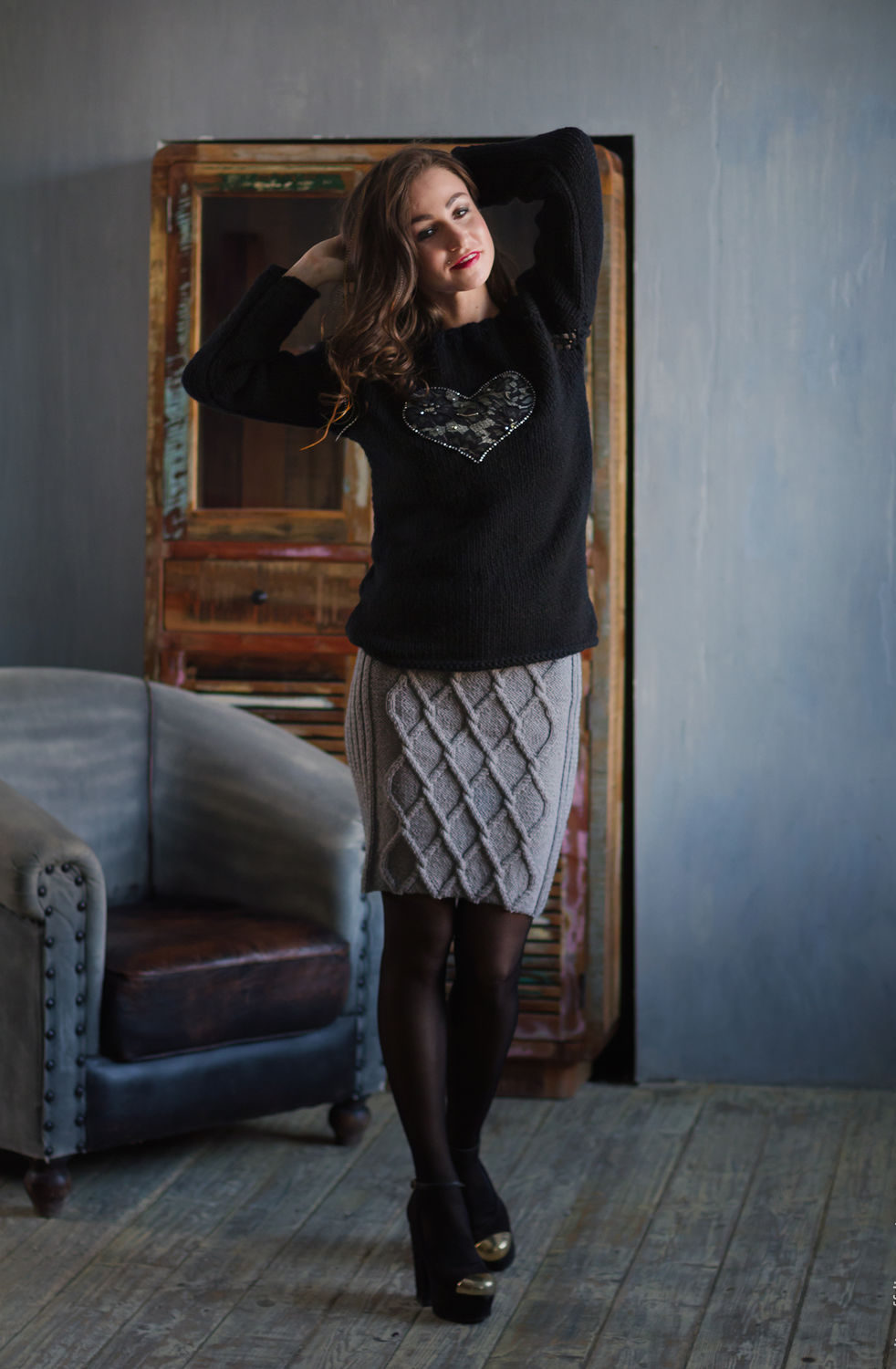 A woolen blue pencil skirt complete with a blue sweater looks easy and feminine.