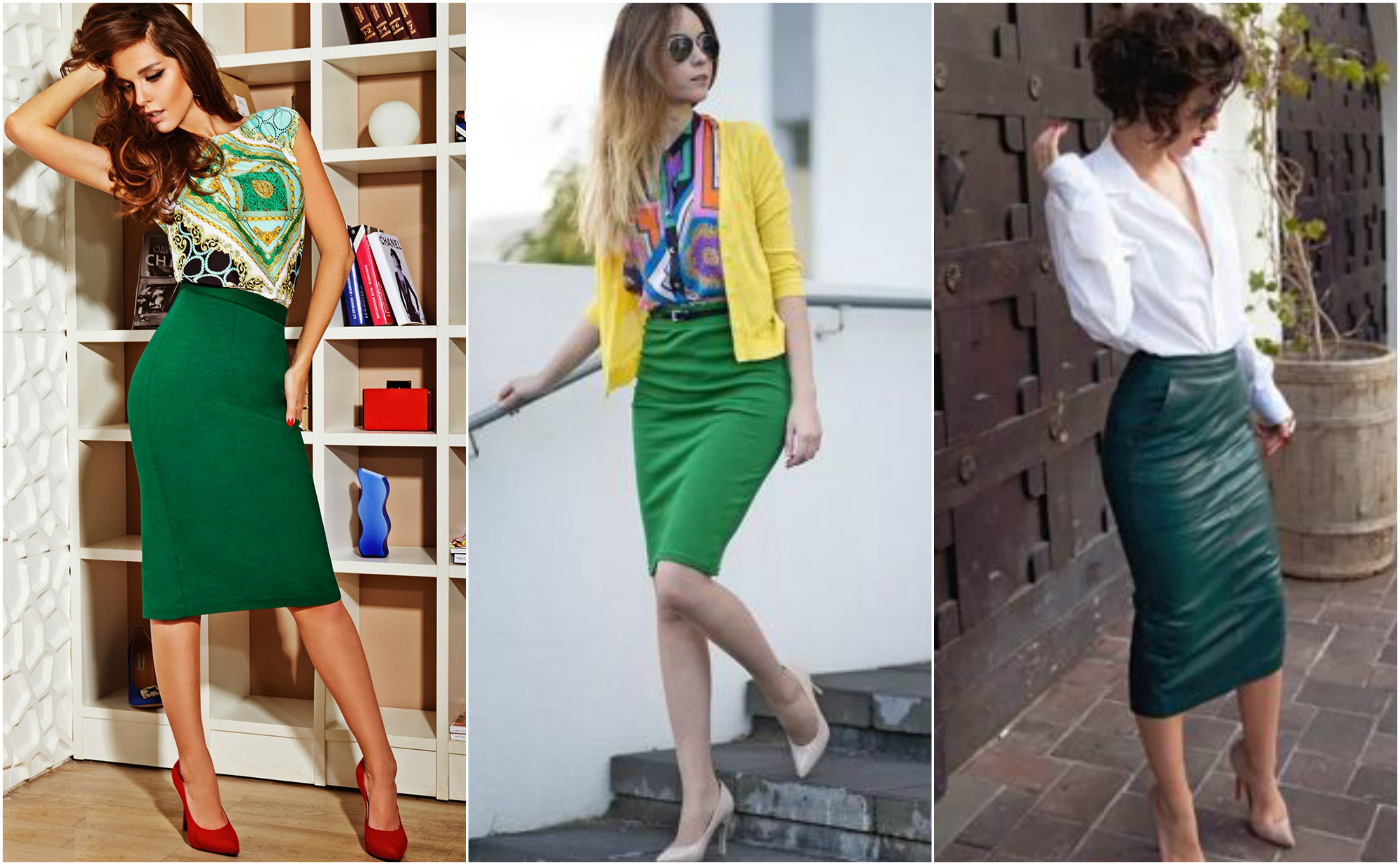 Green and pink shades of skirts go well with bright-colored blouses.