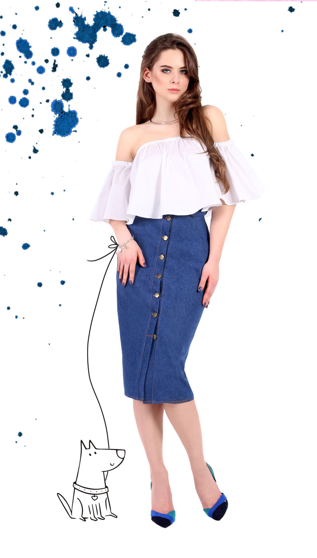 Create a romantic bow with a combination of a denim pencil skirt and an original top.