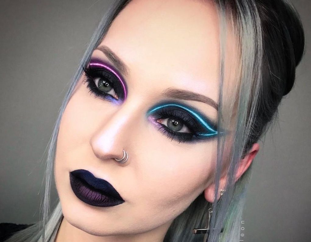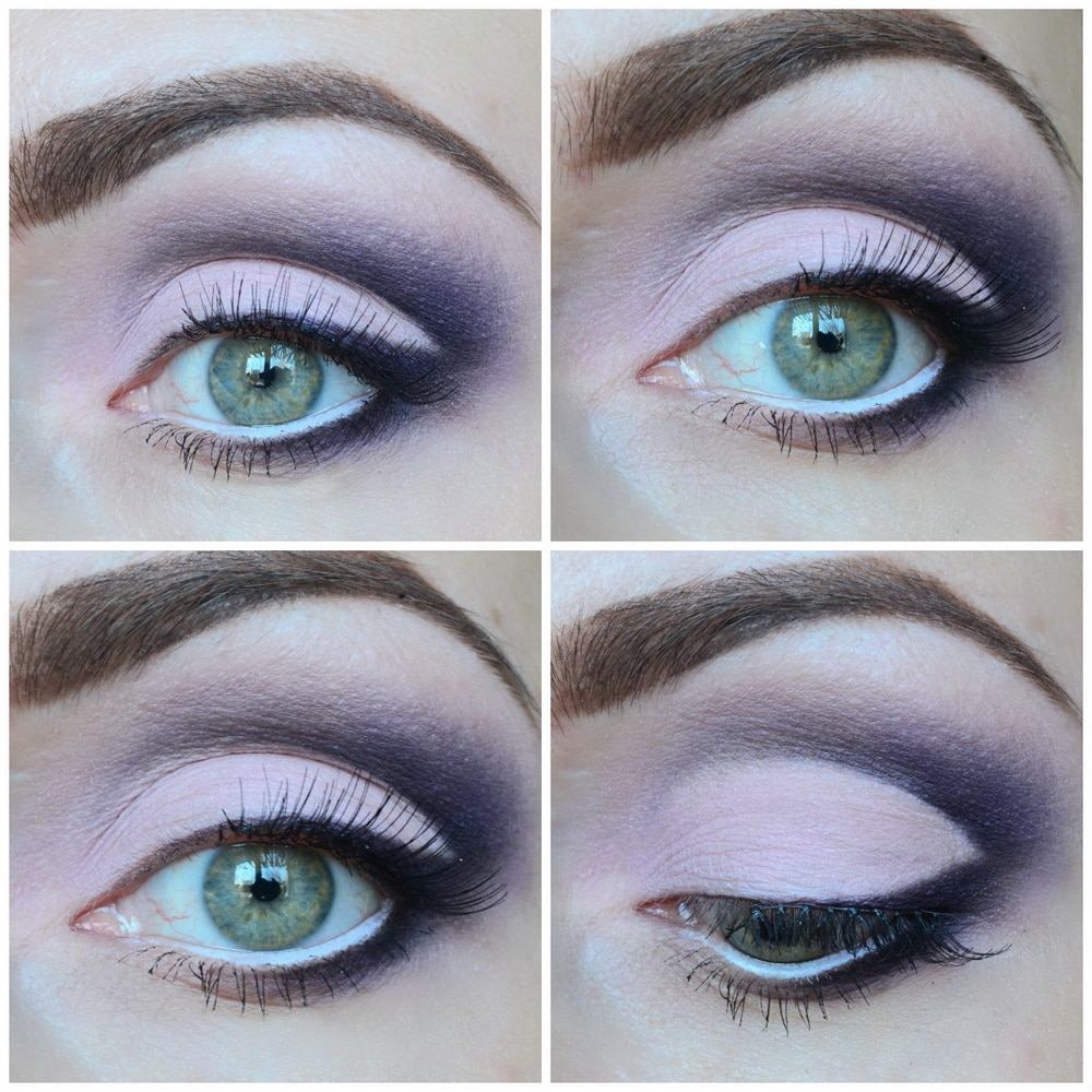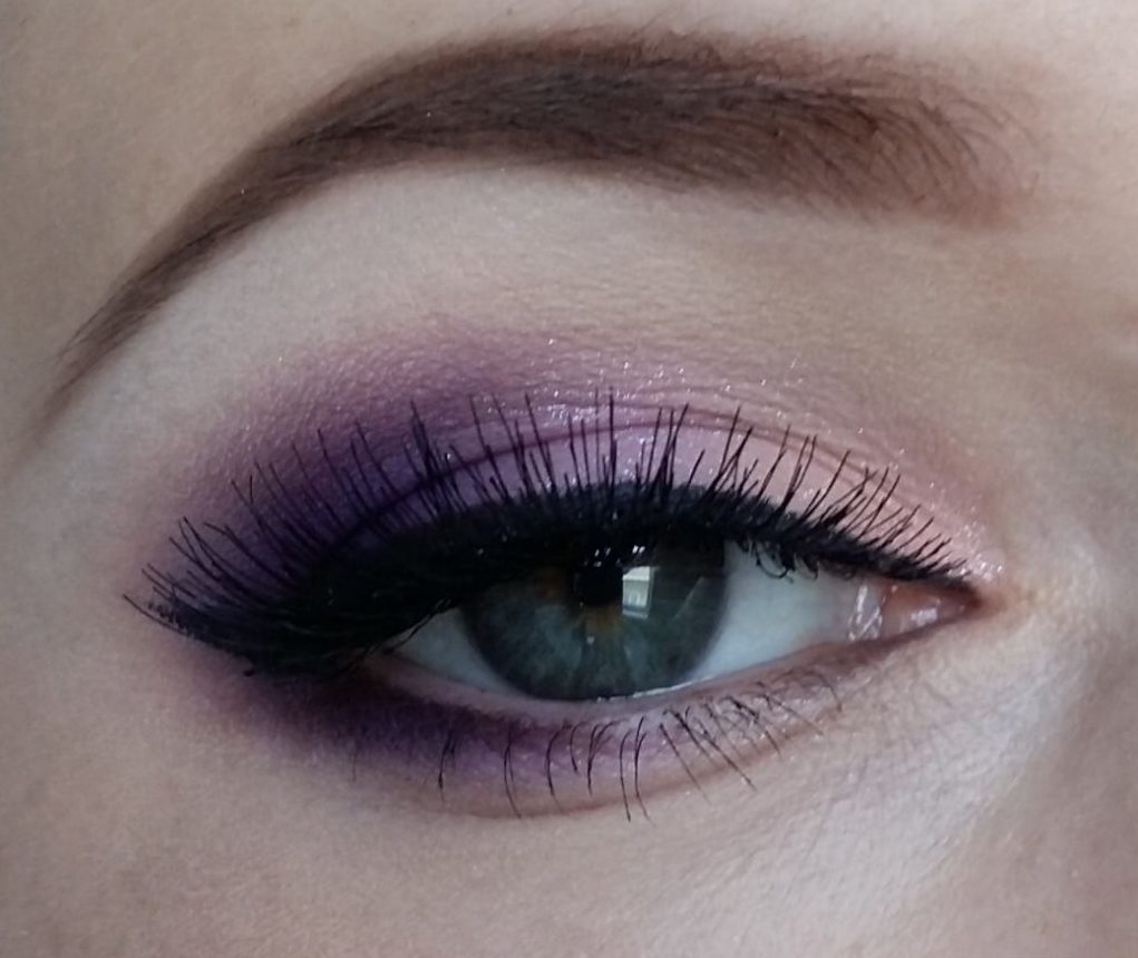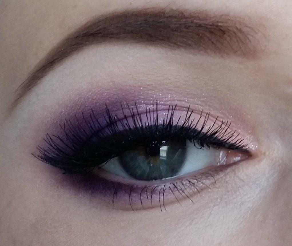 The moving eyelid, as well as the inner corner of the eye, usually stands out in purple. In other embodiments, tinting of the lower eyelid with shadows instead of a pencil is possible. Violet eye shadow blends perfectly with a black pencil and black eyeliner.
