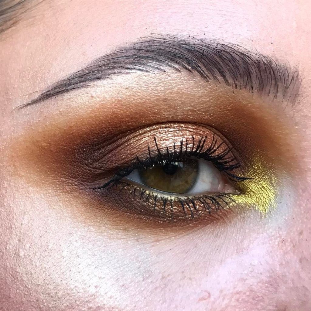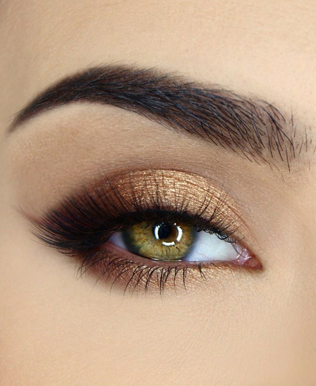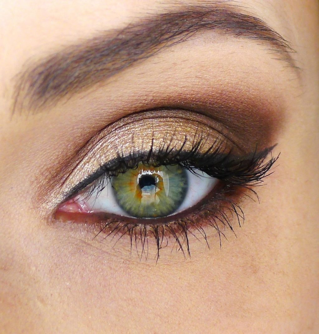 Golden makeup best emphasizes such an interesting olive eye color. Gold (bronze) shadows are best used in combination with brown shades. Brown will look spectacular matte texture, and apply best, well shading, in the inner corner of the eye.
