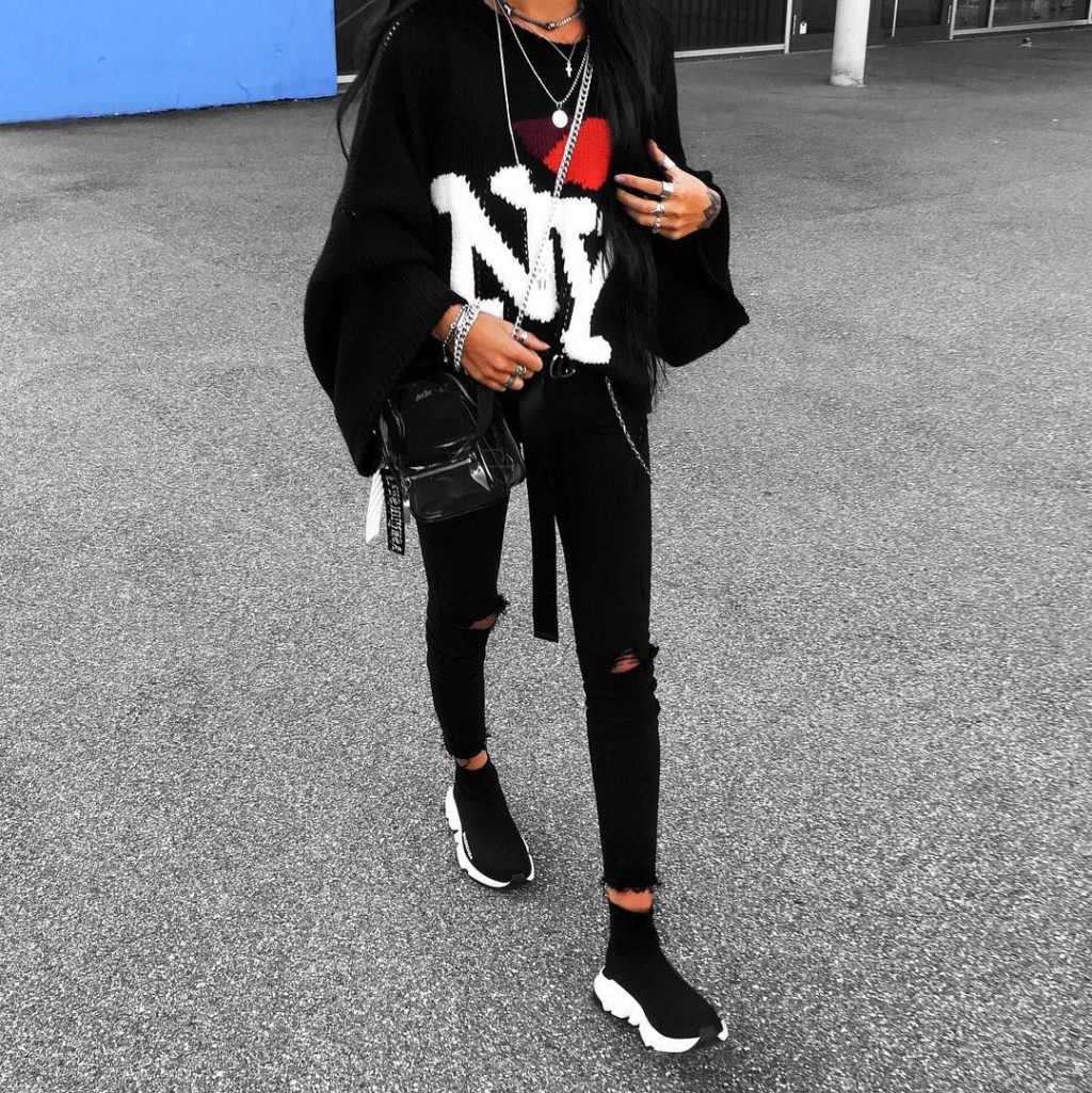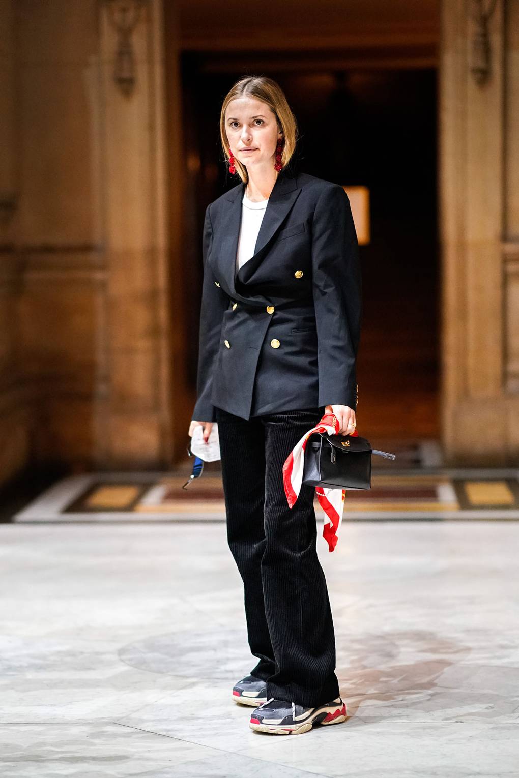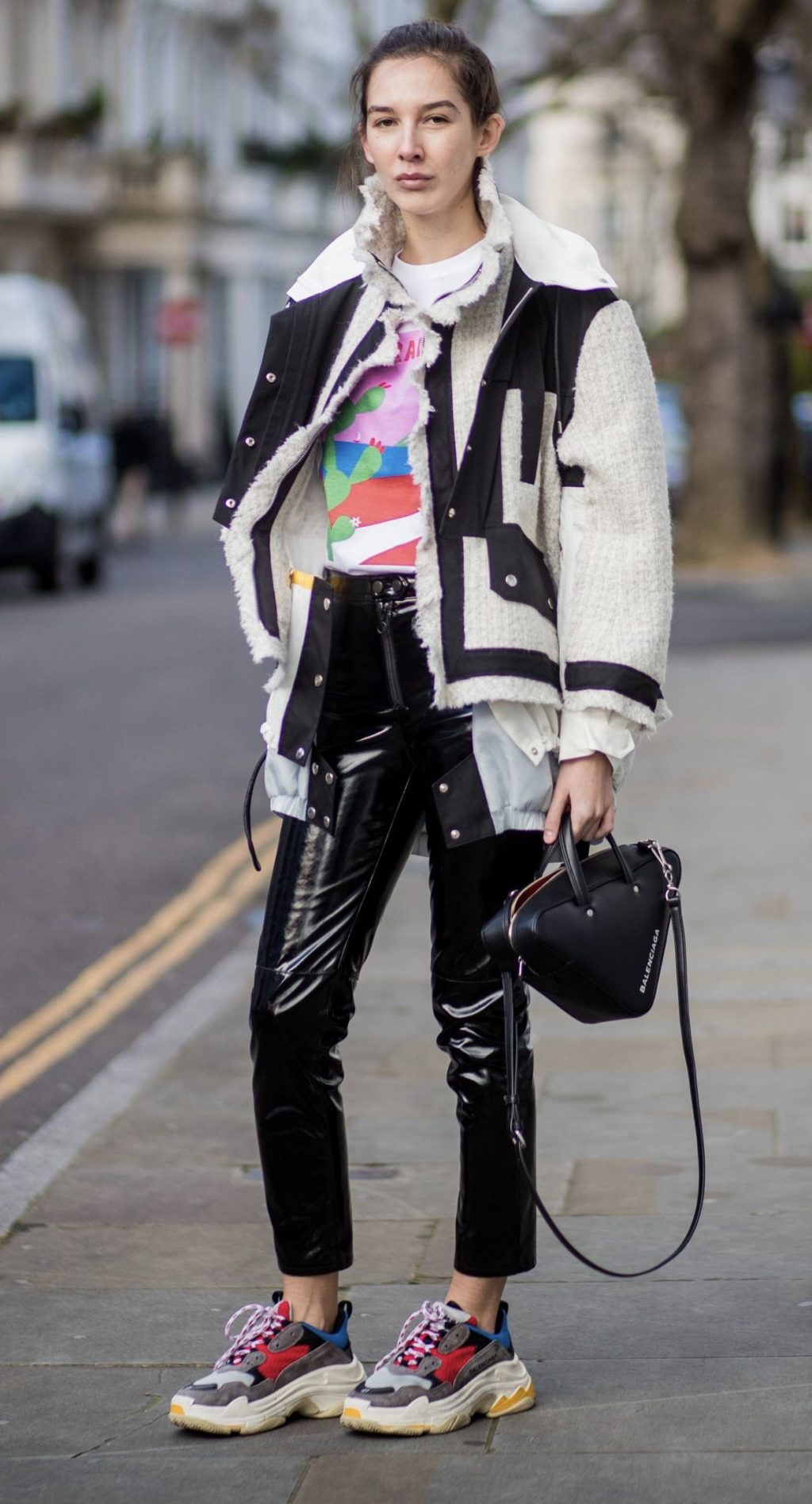 Skinny trousers and jeans combined with a jacket or sweater are a great option for everyday style. Gray or black Runnes sneakers from Balenciaga will make this look more comfortable.