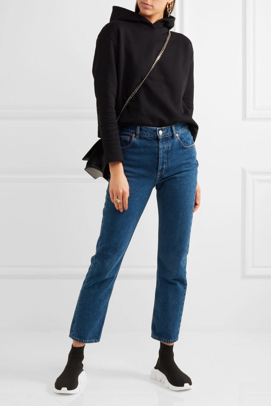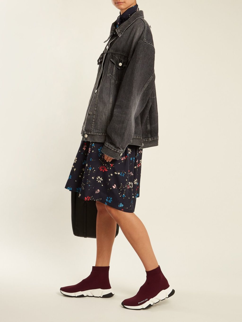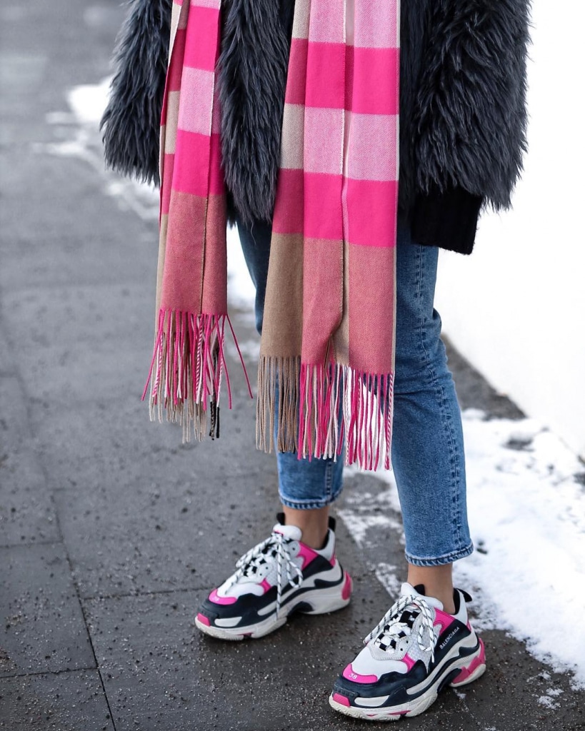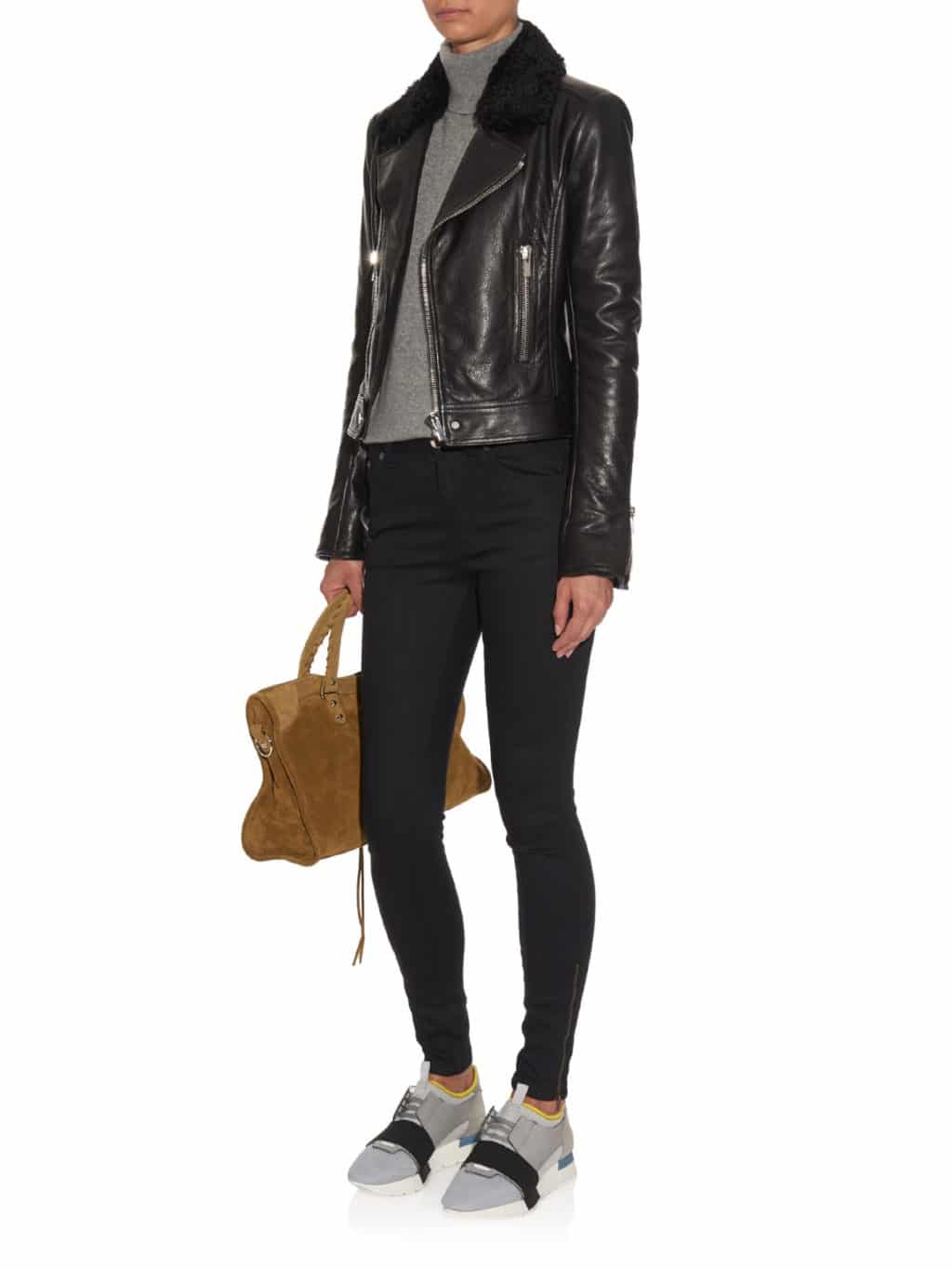 Skinny trousers and jeans combined with a jacket or sweater are a great option for everyday style. Gray or black Runnes sneakers from Balenciaga will make this look more comfortable.