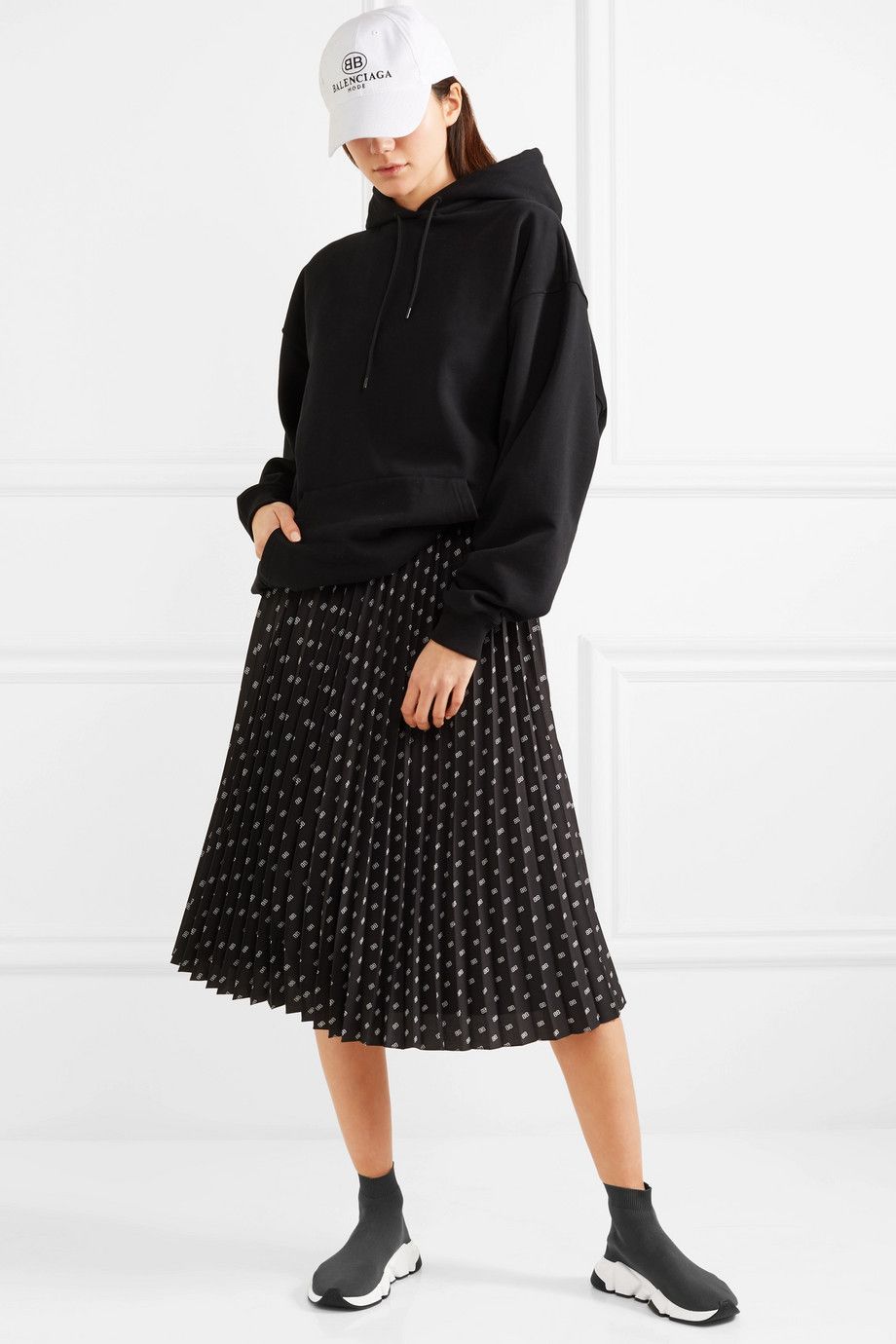 To create a stylish look, create a short blue dress and wear a white printed cardigan and white Tripl S sneakers.