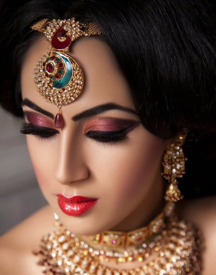 But lipstick nude is also considered a popular option. Especially matte texture. Oriental women often choose the color of lipstick to match their dress or bandana. In general, an oriental image is created in combination with bright dresses and make-up.