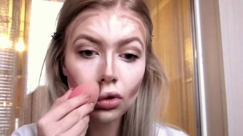Then proceed to shading. In the area of the cheekbones, dark lines, with the help of the applicator, blend the contouring upward, as if trying to erase the line itself, but not to the end. Our task is to make the cheekbones less expressive, but we need them to be.