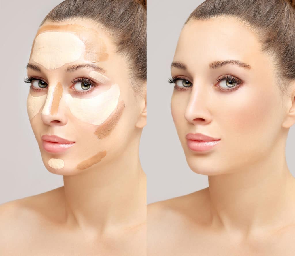 For the effect of creating porcelain skin, you need, when ready to contour the face, apply light powder to the skin. With the help of the applicator, you should well tint with powder all your “edges” of contouring that remained after shading.