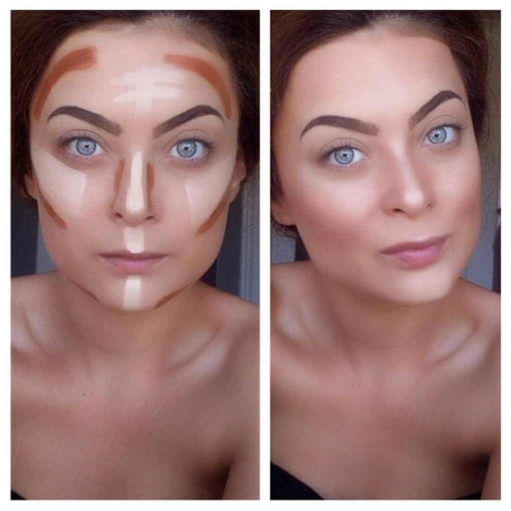 To visually reduce the entire face, you will need to apply dark strokes by contouring to the outline of your face, as indicated in the figure. Also, apply a creamy light contour cream on the area of the center of the forehead, the area under the eyes and chin. Such contouring is sold in ordinary sticks, which is very convenient if you need a little cosmetic.