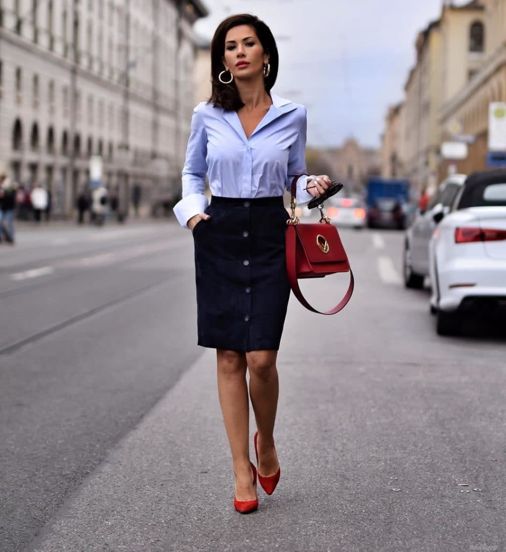 For the office style, a classic black pencil skirt with a blue shirt tucked inside is suitable. Finish your outfit and give it piquancy, red stilettos and the same color handbag.