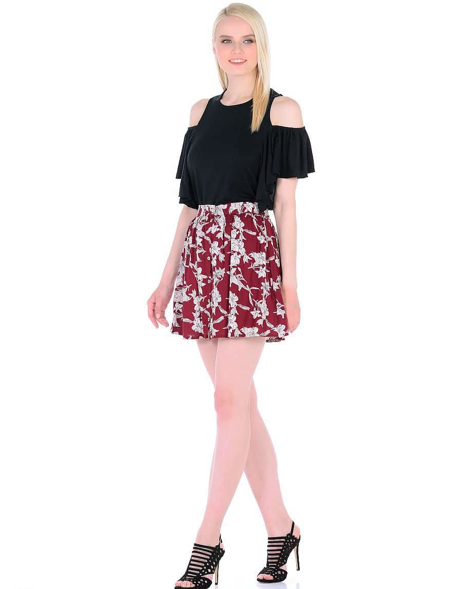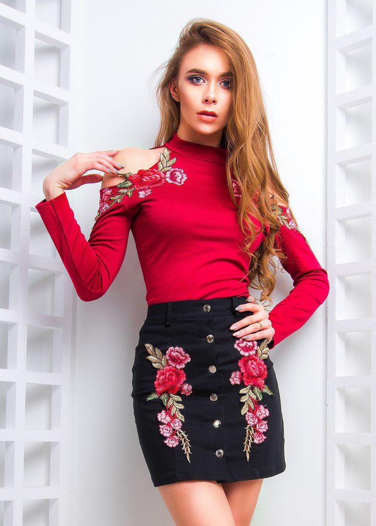You will receive an interesting tender by wearing a black mini skirt with a print in the form of flowers, and a red turtleneck with the same pattern. Your look will be sexy and impressive.