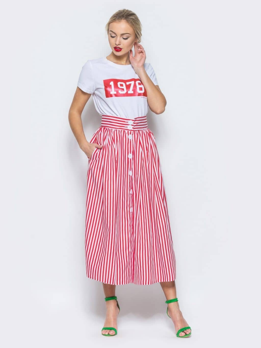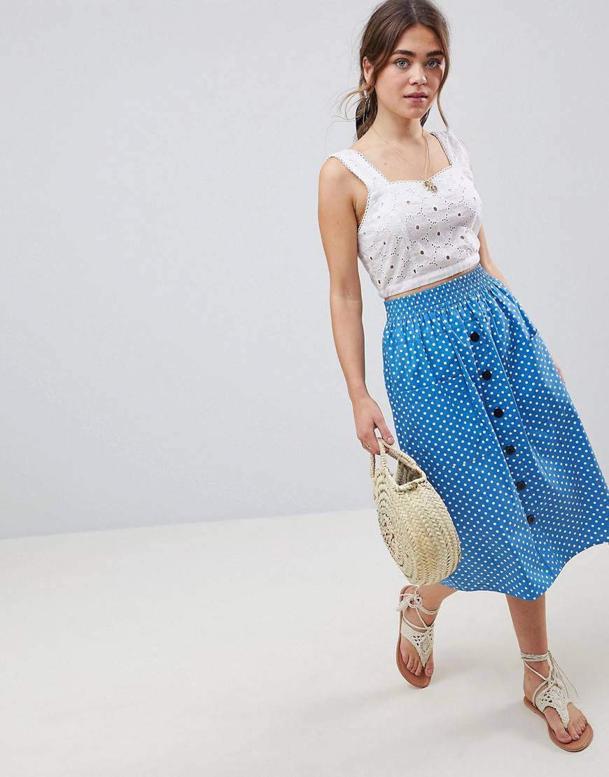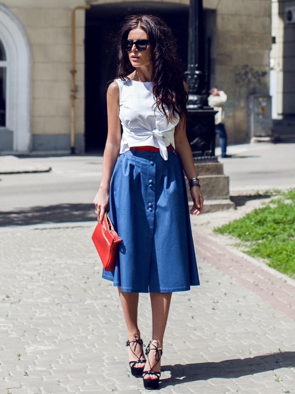 And, combining in one image a bright midi skirt in front with buttons, with a top, we will make the image light and unobtrusive.