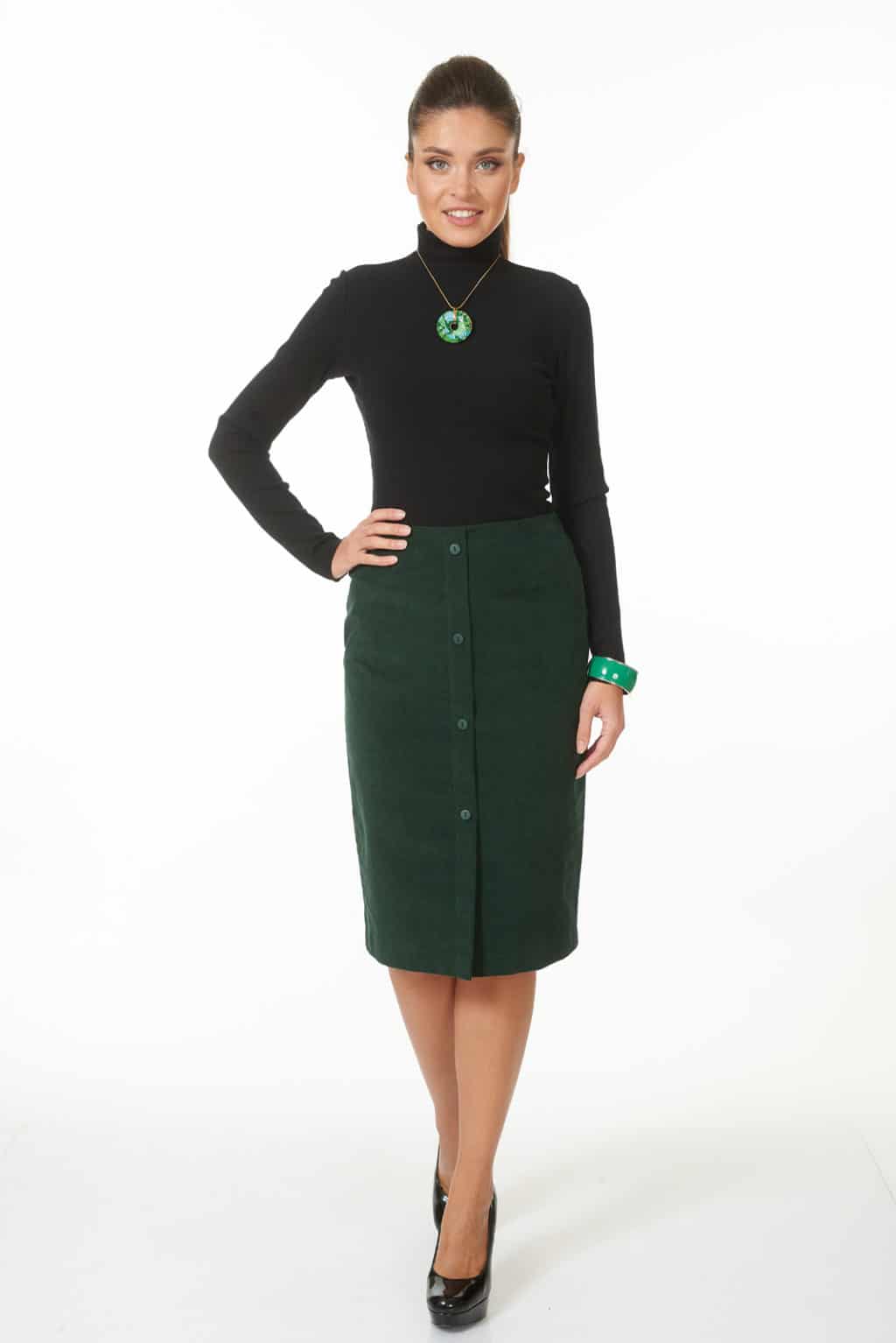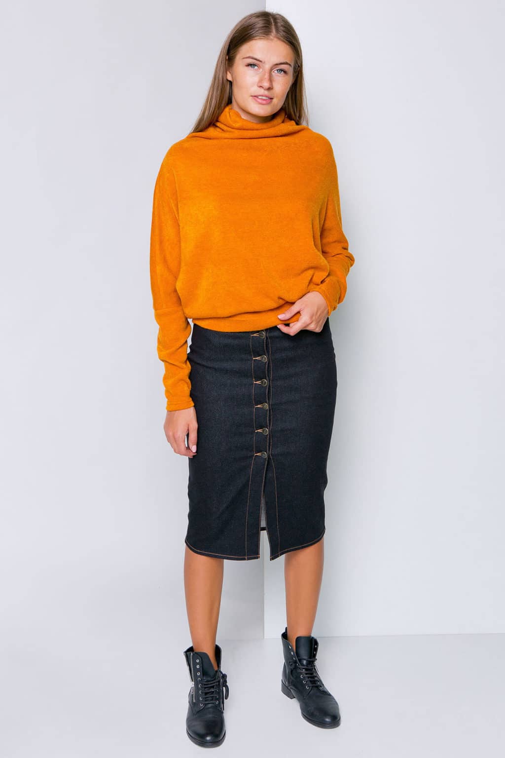 In a knitted version, a pencil skirt with buttons looks just as impressive. Such a skirt long below the knees complete with a dark turtleneck and black boots is a good option for the cold season.