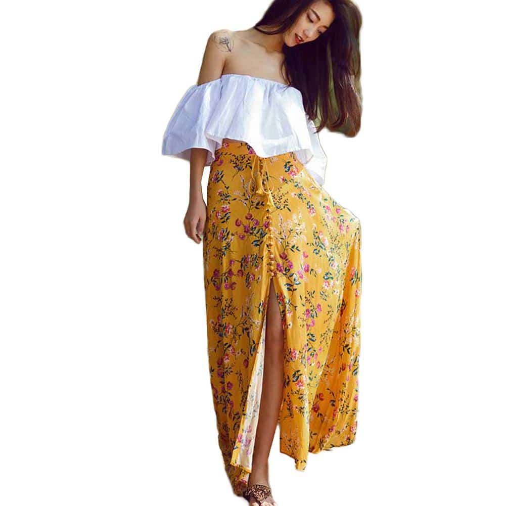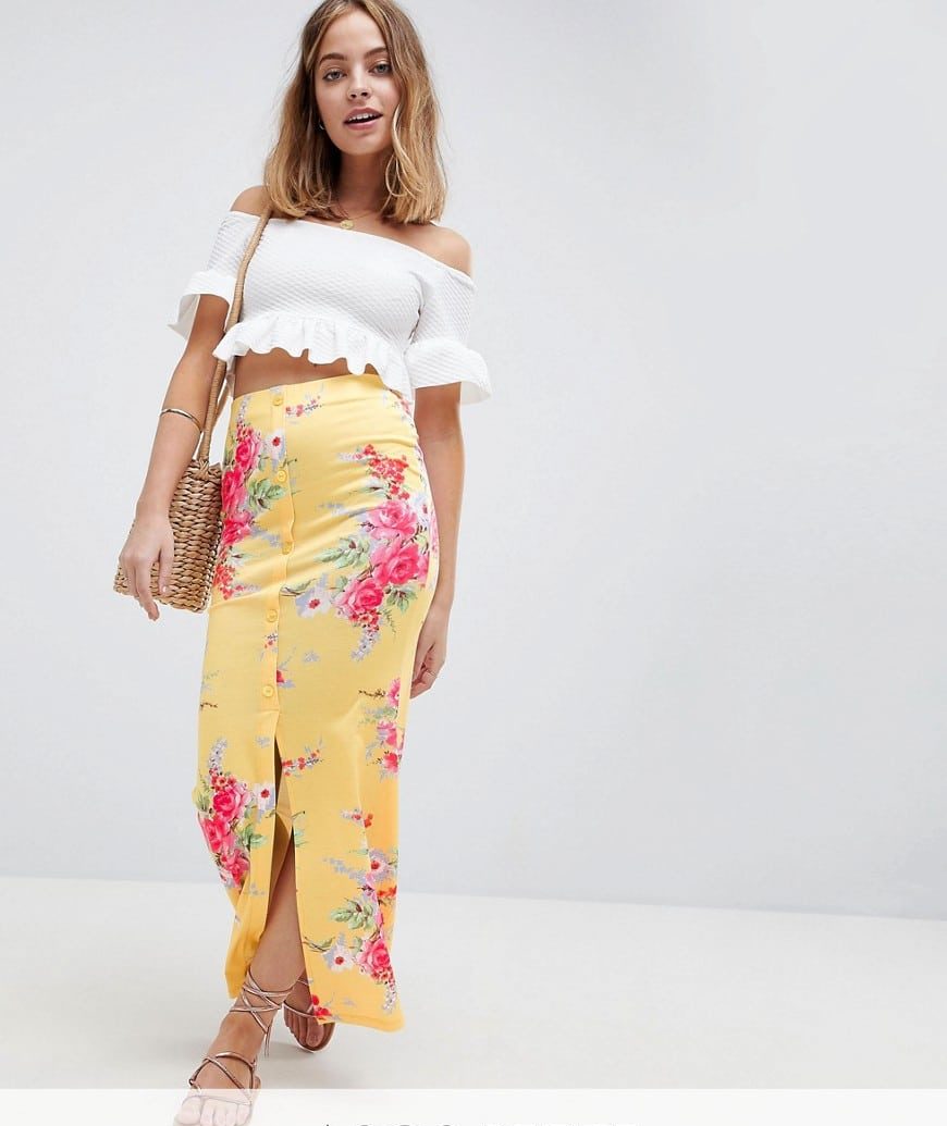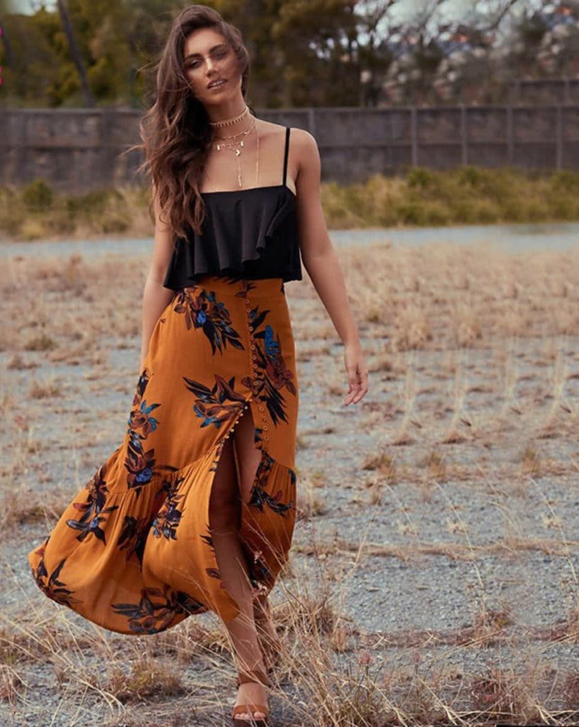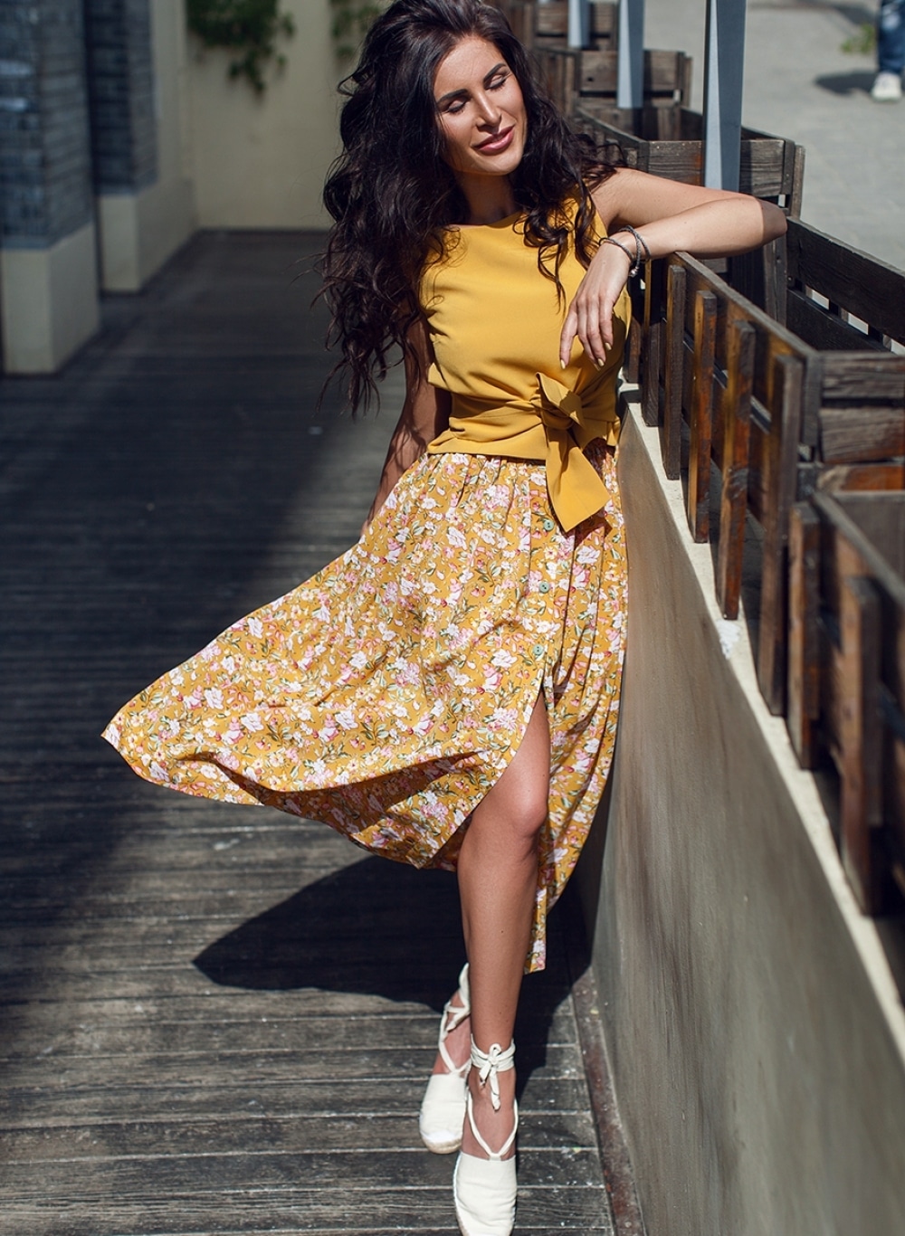 Thus, buttoned skirts with a floral print are ideal for relaxation and an original look. A yellow long light skirt with floral motifs looks great with a top decorated with a flounce. Complement your look with flat sandals.