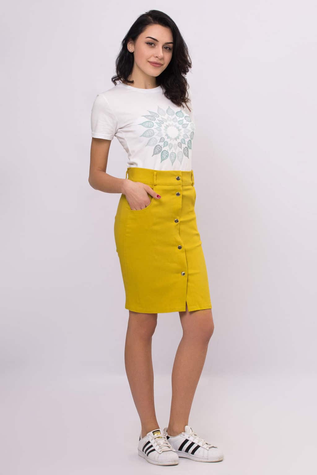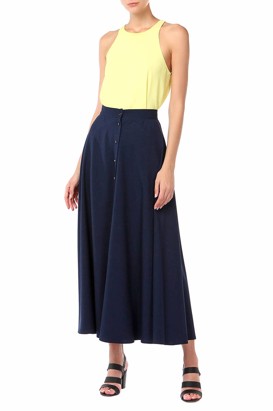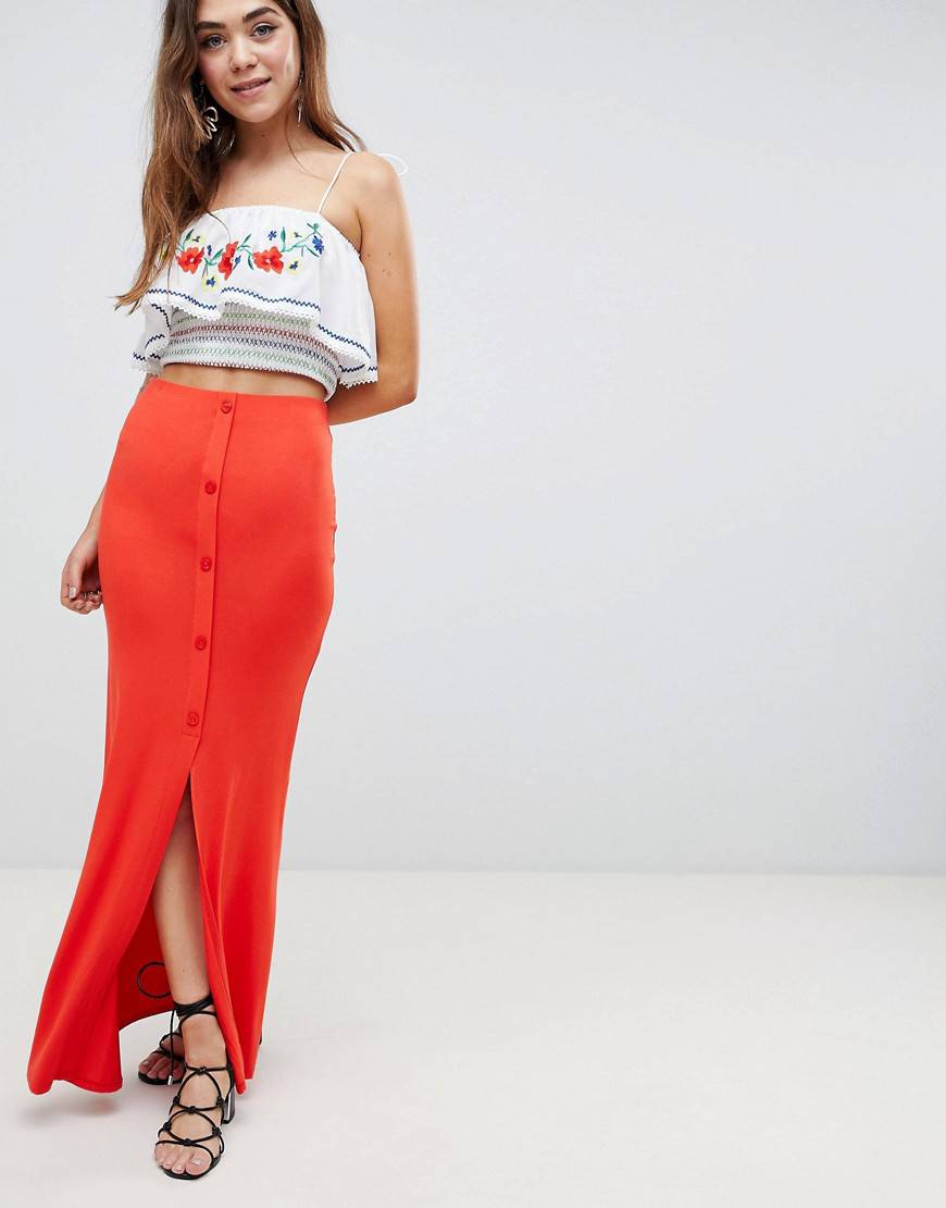 Thus, buttoned skirts with a floral print are ideal for relaxation and an original look. A yellow long light skirt with floral motifs looks great with a top decorated with a flounce. Complement your look with flat sandals.